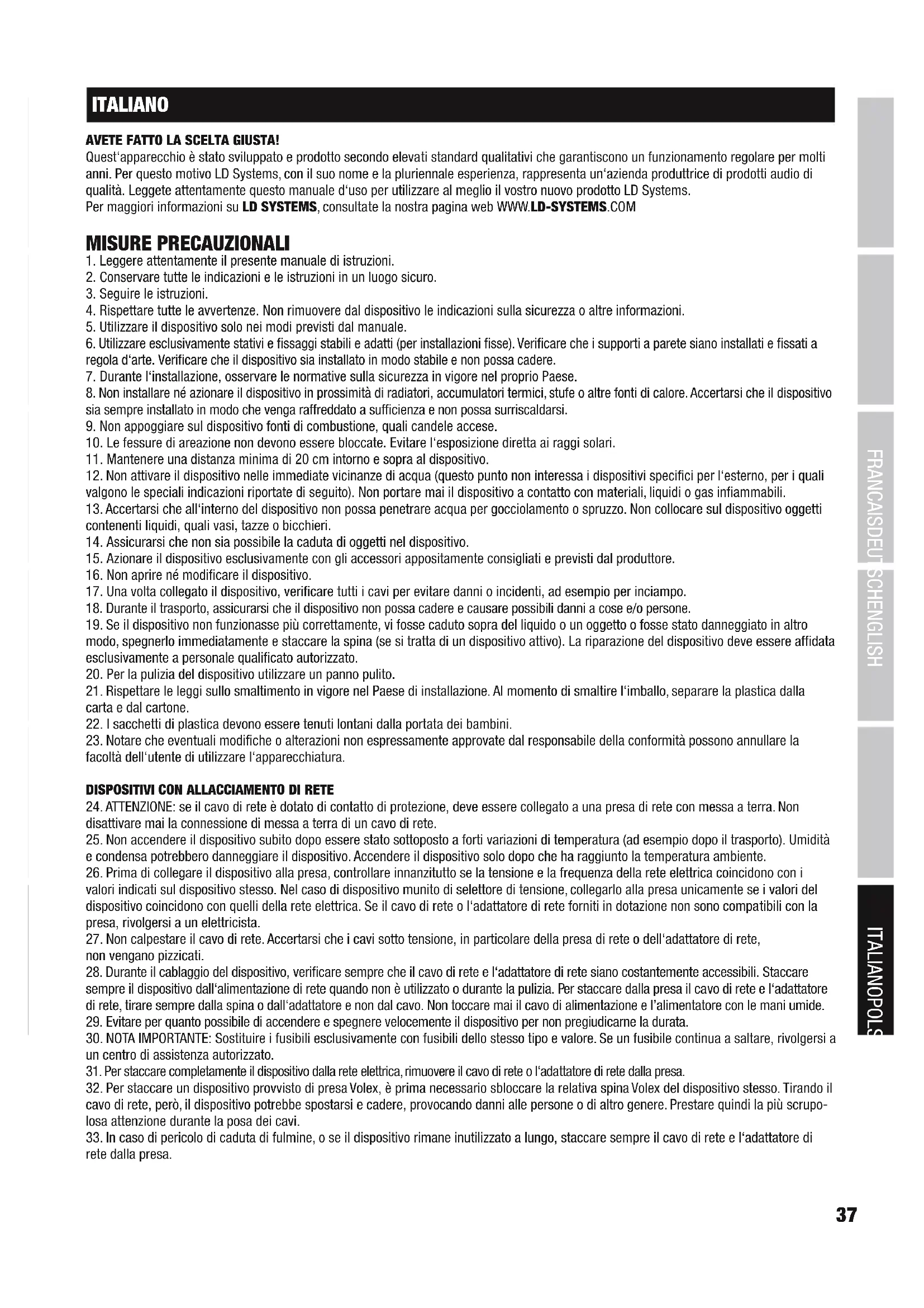 ITALIANO AVETE FATTO LA SCELTA GIUSTA! Quest‘apparecchio è stato sviluppato e prodotto secondo elevati standard qualitativi che garantiscono un funzionamento regolare per molti anni. Per questo motivo LD Systems, con il suo nome e la pluriennale esperienza, rappresenta un‘azienda produttrice di prodotti audio di qualità. Leggete attentamente questo manuale d‘uso per utilizzare al meglio il vostro nuovo prodotto LD Systems. Per maggiori informazioni su LD SYSTEMS, consultate la nostra pagina web WWW.LD-SYSTEMS.COM MISURE PRECAUZIONALI
