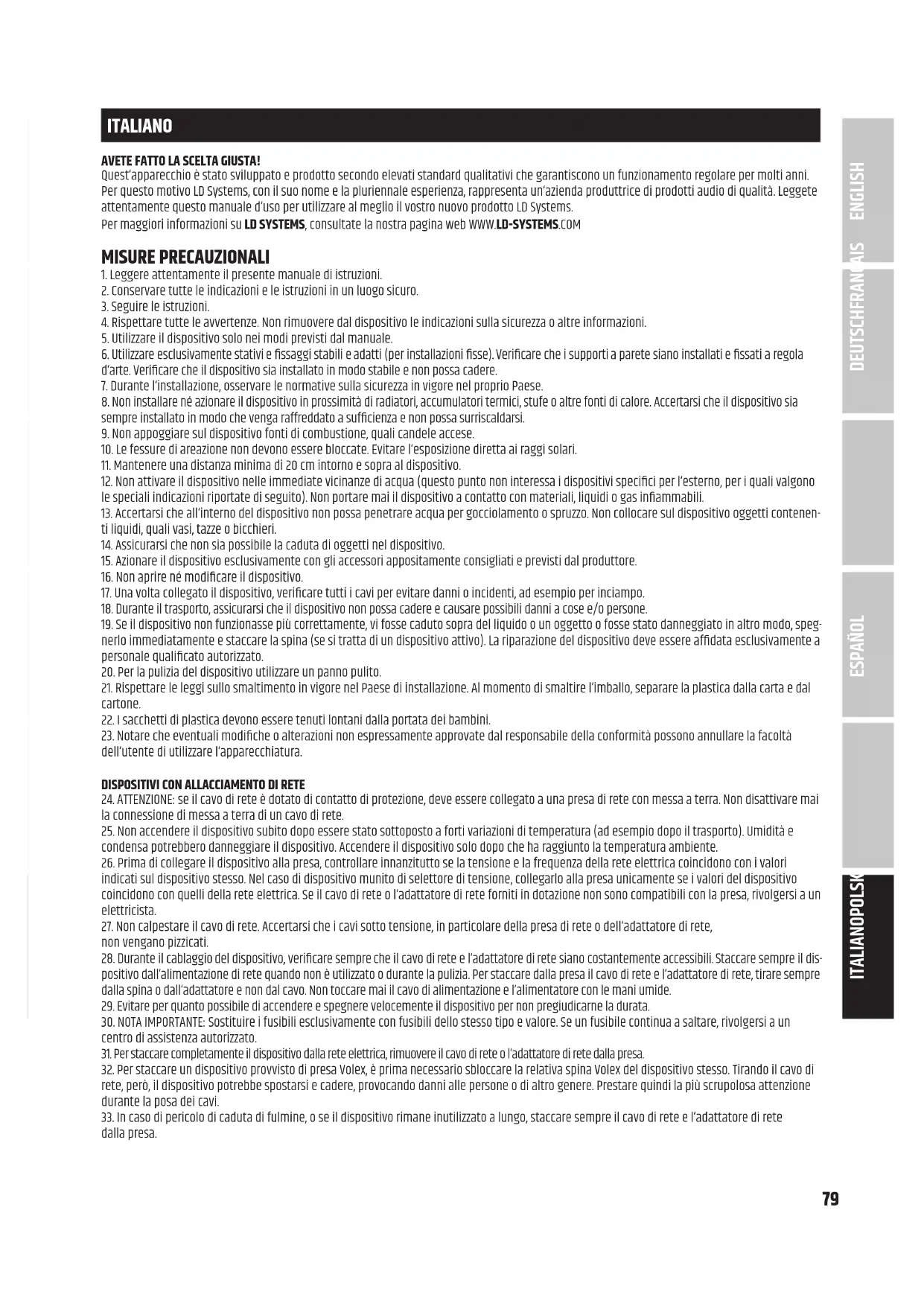 GARANZIA DEL PRODUTTORE E LIMITAZIONE DI RESPONSABILITÀ Le nostre attuali condizioni di garanzia e la limitazione di responsabilità sono consultabili alla pagina: https://cdn-shop.adamhall.com/media/pdf/ MANUFACTURERS-DECLARATIONS_LD_SYSTEMS.pdf. In caso di assistenza, rivolgersi a Adam Hall GmbH, Adam-Hall-Str. 1, 61267 Neu Anspach / E-mail Info@adamhall.com / +49 (0)6081 / 9419-0.