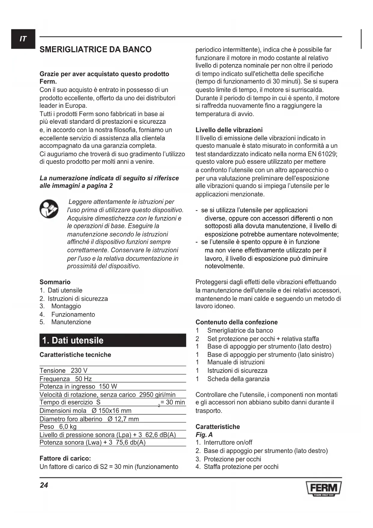 = 30 min Dimensioni mola Ø 150x16 mm Diametro foro alberino Ø 12,7 mm Peso 6,0 kg Livello di pressione sonora (Lpa) + 3 62,6 dB(A) Potenza sonora (Lwa) + 3 75,6 db(A) Fattore di carico: Un fattore di carico di S2 = 30 min (funzionamento periodico intermittente), indica che è possibile far funzionare il motore in modo costante al relativo livello di potenza nominale per non oltre il periodo di tempo indicato sull'etichetta delle specifiche (tempo di funzionamento di 30 minuti). Se si supera questo limite di tempo, il motore si surriscalda. Durante il periodo di tempo in cui è spento, il motore si raffredda nuovamente fino a raggiungere la temperatura di avvio. Livello delle vibrazioni Il livello di emissione delle vibrazioni indicato in questo manuale è stato misurato in conformità a un test standardizzato indicato nella norma EN 61029; questo valore può essere utilizzato per mettere a confronto l’utensile con un altro apparecchio o per una valutazione preliminare dell'esposizione alle vibrazioni quando si impiega l’utensile per le applicazioni menzionate. - se si utilizza l’utensile per applicazioni diverse, oppure con accessori differenti o non sottoposti alla dovuta manutenzione, il livello di esposizione potrebbe aumentare notevolmente; - se l’utensile è spento oppure è in funzione ma non viene effettivamente utilizzato per il lavoro, il livello di esposizione può diminuire notevolmente. Proteggersi dagli effetti delle vibrazioni effettuando la manutenzione dell'utensile e dei relativi accessori, mantenendo le mani calde e seguendo un metodo di lavoro idoneo. Contenuto della confezione 1 Smerigliatrice da banco 2 Set protezione per occhi + relativa staffa 1 Base di appoggio per strumento (lato destro) 1 Base di appoggio per strumento (lato sinistro) 1 Manuale di istruzioni 1 Istruzioni di sicurezza 1 Scheda della garanzia Controllare che l'utensile, i componenti non montati e gli accessori non abbiano subito danni durante il trasporto. Caratteristiche Fig. A