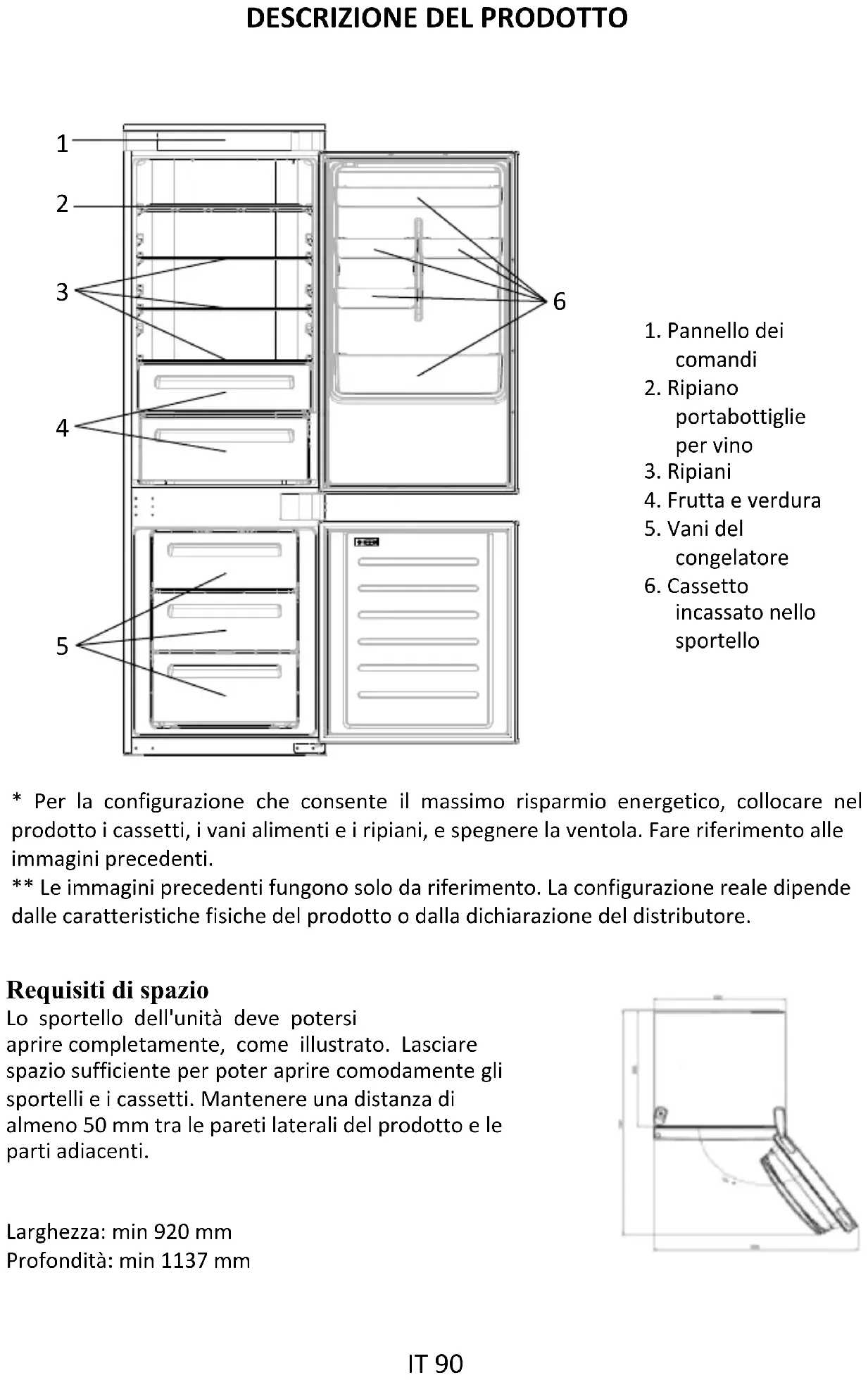 - Per la configurazione che consente il massimo risparmio energetico, collocare nel prodotto i cassetti, i vani alimenti e i ripiani, e spegnere la ventola. Fare riferimento alleimmagini precedenti.** Le immagini precedenti fungono solo da riferimento. La configurazione reale dipendedalle caratteristiche fisiche del prodotto o dalla dichiarazione del distributore. Requisiti di spazio Lo sportello dell'unità deve potersi aprire completamente, come illustrato. Lasciare spazio sufficiente per poter aprire comodamente gli sportelli e i cassetti. Mantenere una distanza di almeno 50 mm tra le pareti laterali del prodotto e le parti adiacenti.Larghezza: min 920 mmProfondità: min 1137 mm