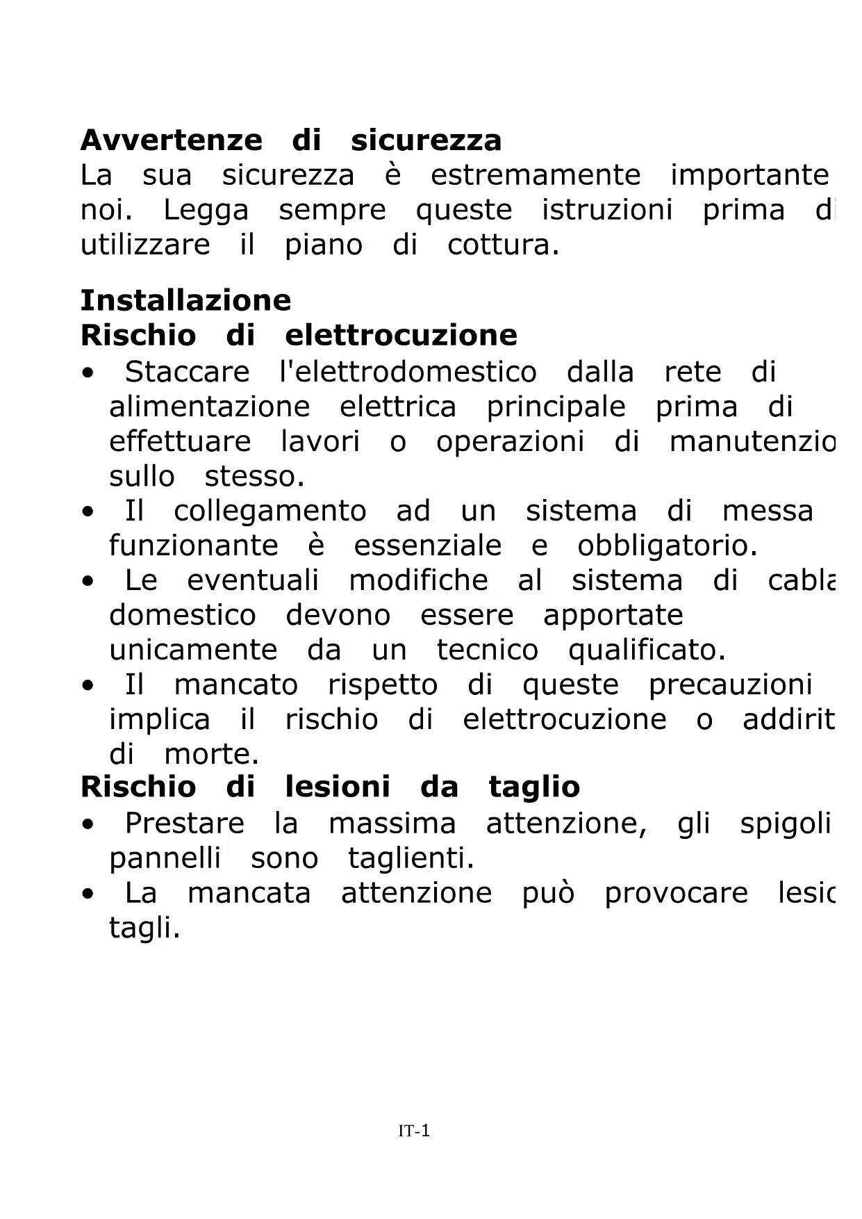 - Use pans whose diameter is as large as the graphic of the zone selected. EN-31IT-1 Avvertenze di sicurezza La sua sicurezza è estremamente importante per noi. Legga sempre queste istruzioni prima di utilizzare il piano di cottura. Installazione Rischio di elettrocuzione