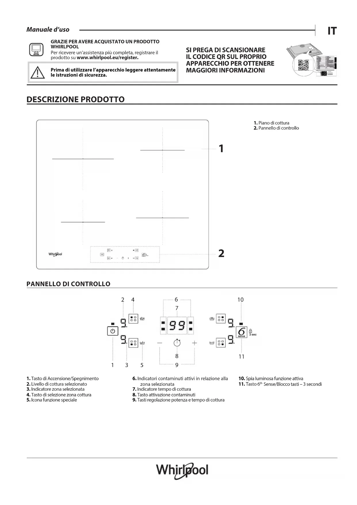 1. Tasto di Accensione/Spegnimento2. Livello di cottura selezionato3. Indicatore zona selezionata4. Tasto di selezione zona cottura5. Icona funzione speciale6. Indicatori contaminuti attivi in relazione alla zona selezionata7. Indicatore tempo di cottura8. Tasto attivazione contaminuti9. Tasti regolazione potenza e tempo di cottura10. Spia luminosa funzione attiva11. Tasto 6 Sense/Blocco tasti – 3secondiGRAZIE PER AVERE ACQUISTATO UN PRODOTTO WHIRLPOOLPer ricevere un’assistenza più completa, registrare il prodotto su www.whirlpool.eu/register.