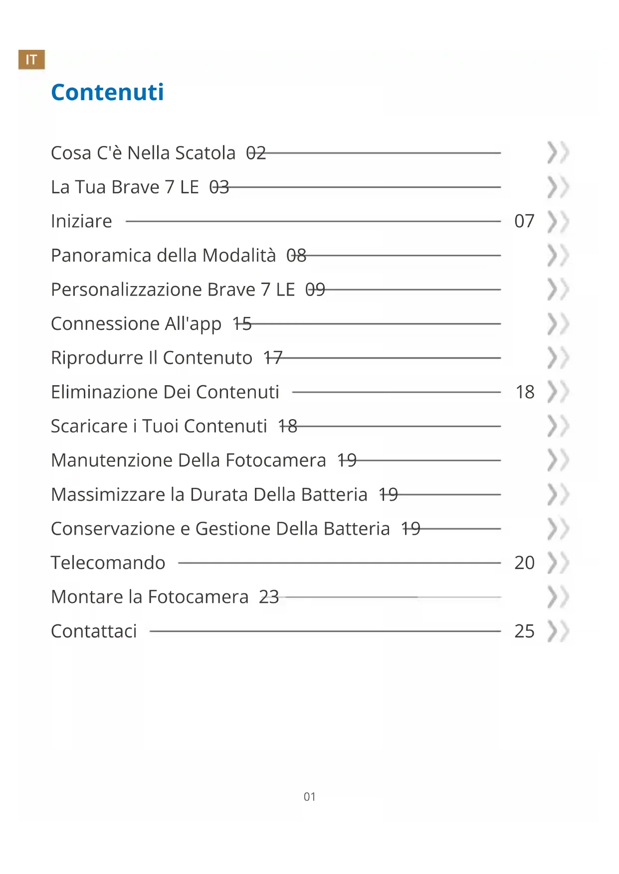 25BRAVE 7 LE V1.8 FOTOCAMERA D'AZIONE MANUALE UTENTEContenuti Cosa C'è Nella Scatola 02 La Tua Brave 7 LE 03 Iniziare 07 Panoramica della Modalità 08 Personalizzazione Brave 7 LE 09 Connessione All'app 15 Riprodurre Il Contenuto 17 Eliminazione Dei Contenuti 18 Scaricare i Tuoi Contenuti 18 Manutenzione Della Fotocamera 19 Massimizzare la Durata Della Batteria 19 Conservazione e Gestione Della Batteria 19 Telecomando 20 Montare la Fotocamera 23 Contattaci 25