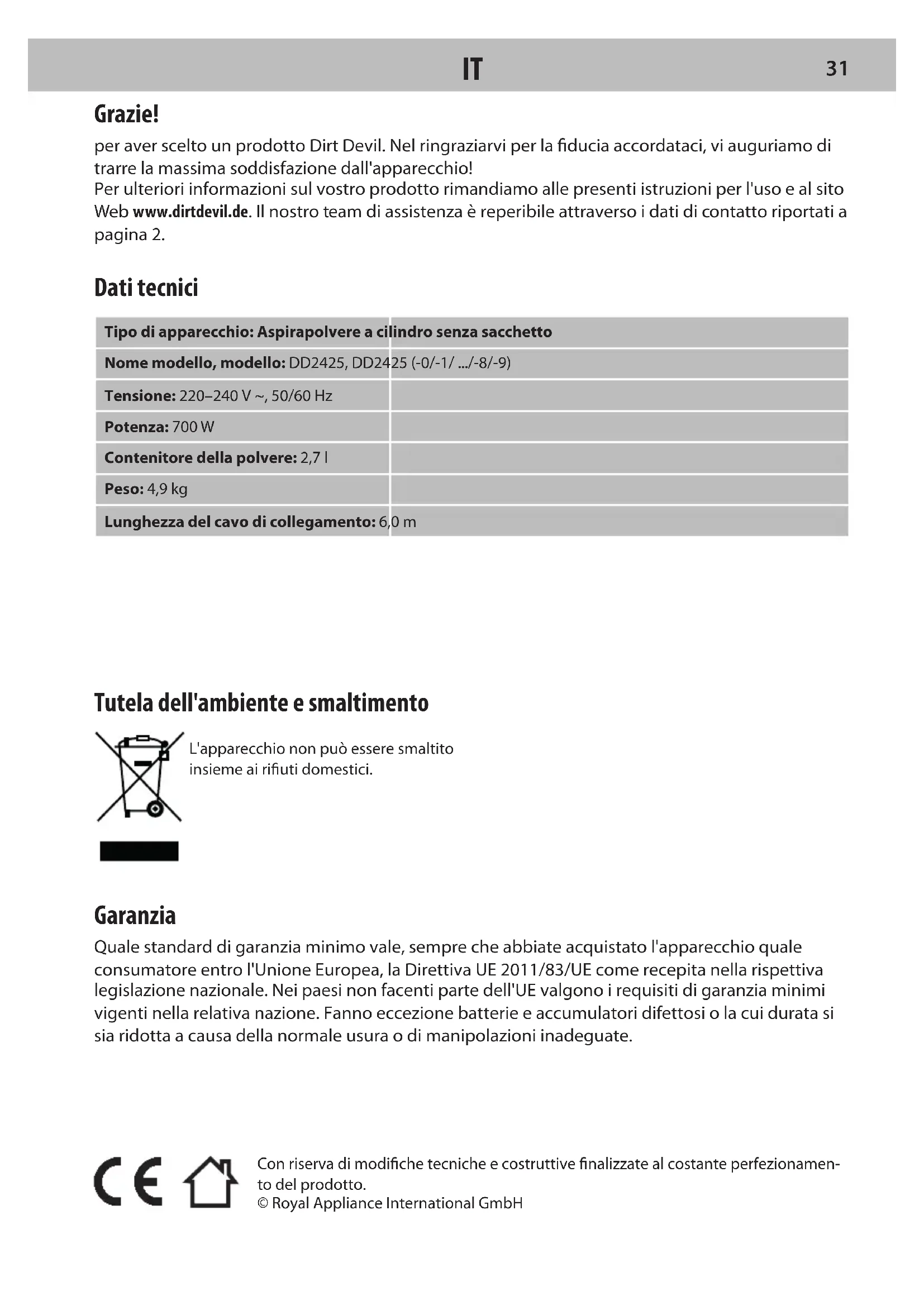ESTutela dell'ambiente e smaltimento L'apparecchio non può essere smaltito insieme ai riuti domestici. Garanzia Quale standard di garanzia minimo vale, sempre che abbiate acquistato l'apparecchio quale consumatore entro l'Unione Europea, la Direttiva UE 2011/83/UE come recepita nella rispettiva legislazione nazionale. Nei paesi non facenti parte dell'UE valgono i requisiti di garanzia minimi vigenti nella relativa nazione. Fanno eccezione batterie e accumulatori difettosi o la cui durata si sia ridotta a causa della normale usura o di manipolazioni inadeguate. Con riserva di modiche tecniche e costruttive nalizzate al costante perfezionamen- to del prodotto. © Royal Appliance International GmbH Grazie! per aver scelto un prodotto Dirt Devil. Nel ringraziarvi per la ducia accordataci, vi auguriamo di trarre la massima soddisfazione dall'apparecchio! Per ulteriori informazioni sul vostro prodotto rimandiamo alle presenti istruzioni per l'uso e al sito Web www.dirtdevil.de. Il nostro team di assistenza è reperibile attraverso i dati di contatto riportati a pagina 2. Dati tecnici Tipo di apparecchio: Aspirapolvere a cilindro senza sacchetto Nome modello, modello: DD2425, DD2425 (-0/-1/ .../-8/-9) Tensione: 220–240 V ~, 50/60 Hz Potenza: 700 W Contenitore della polvere: 2,7 l Peso: 4,9 kg Lunghezza del cavo di collegamento: 6,0 m
