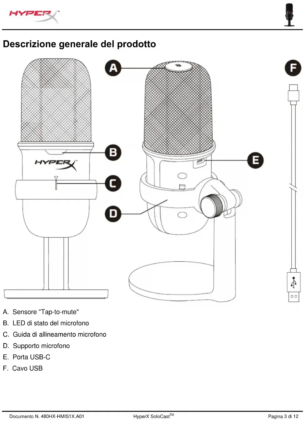 Descrizione generale del prodotto A. Sensore "Tap-to-mute" B. LED di stato del microfono C. Guida di allineamento microfono D. Supporto microfono E. Porta USB-C F. Cavo USBDocumento N. 480HX-HMIS1X.A01 HyperX SoloCast