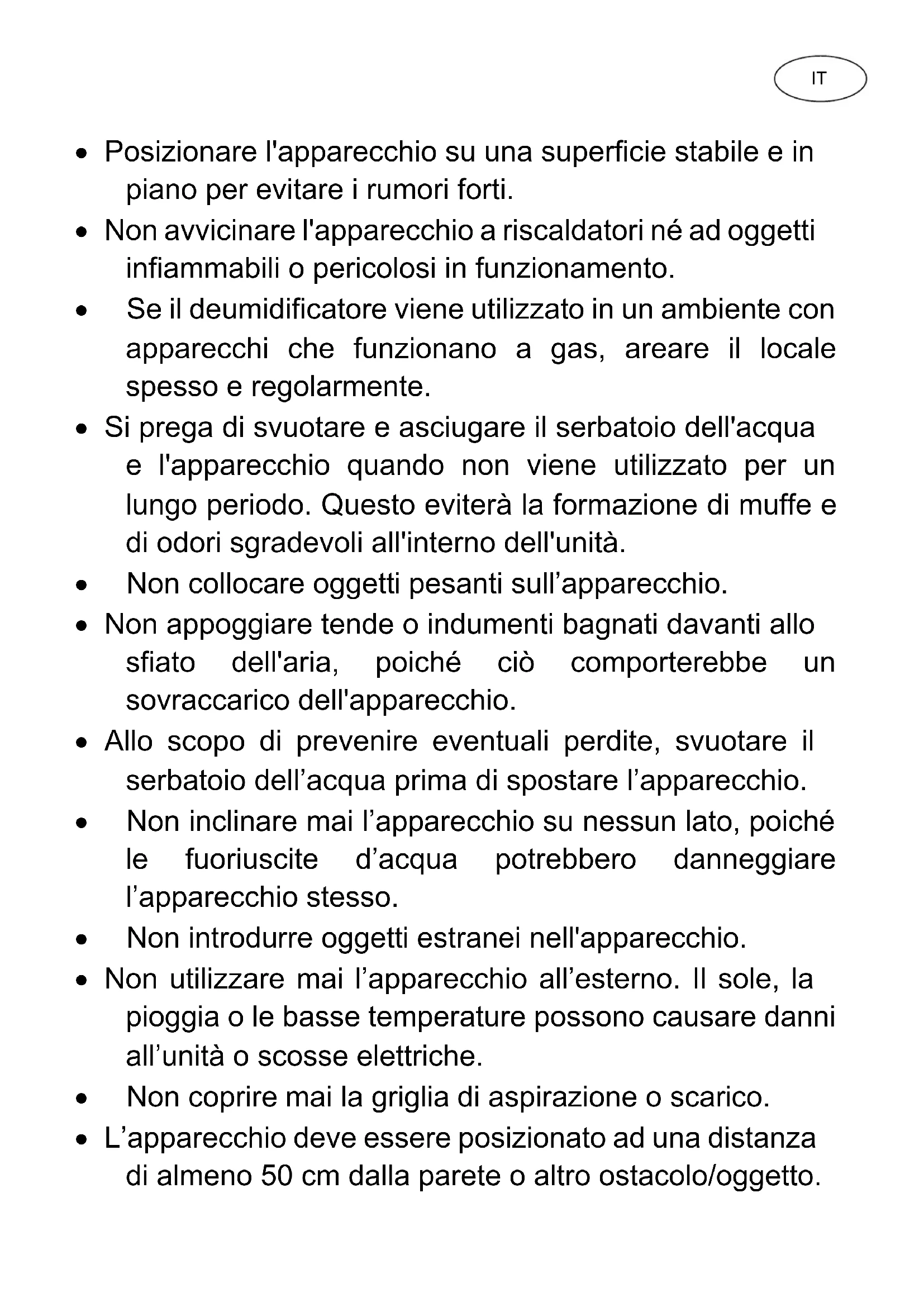 - L’apparecchio deve essere posizionato ad una distanza di almeno 50 cm dalla parete o altro ostacolo/oggetto. IT• Tenere puliti il filtro antipolvere e le griglie di uscita/aspirazione dell’aria. Questi devono essere puliti regolarmente per garantire un rendimento ottimale del dispositivo.