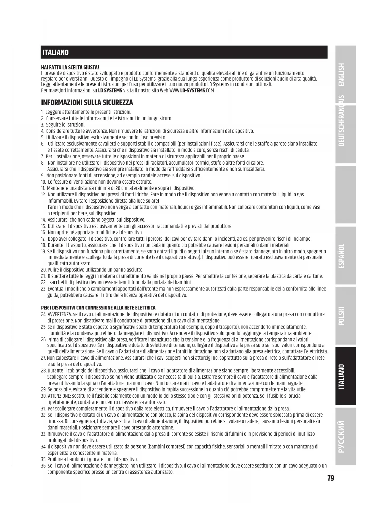 POLSKI ESPAÑOL FRANÇAIS DEUTSCHENGLISH79 ITALIANO HAI FATTO LA SCELTA GIUSTA! Il presente dispositivo è stato sviluppato e prodotto conformemente a standard di qualità elevata al fine di garantire un funzionamento regolare per diversi anni. Questo è l'impegno di LD Systems, grazie alla sua lunga esperienza come produttore di soluzioni audio di alta qualità. Leggiattentamente le presenti istruzioni per l’uso per utilizzare il tuo nuovo prodotto LD Systems in condizioni ottimali. Per maggiori informazioni su LD SYSTEMS visita il nostro sito Web WWW.LD-SYSTEMS.COM
