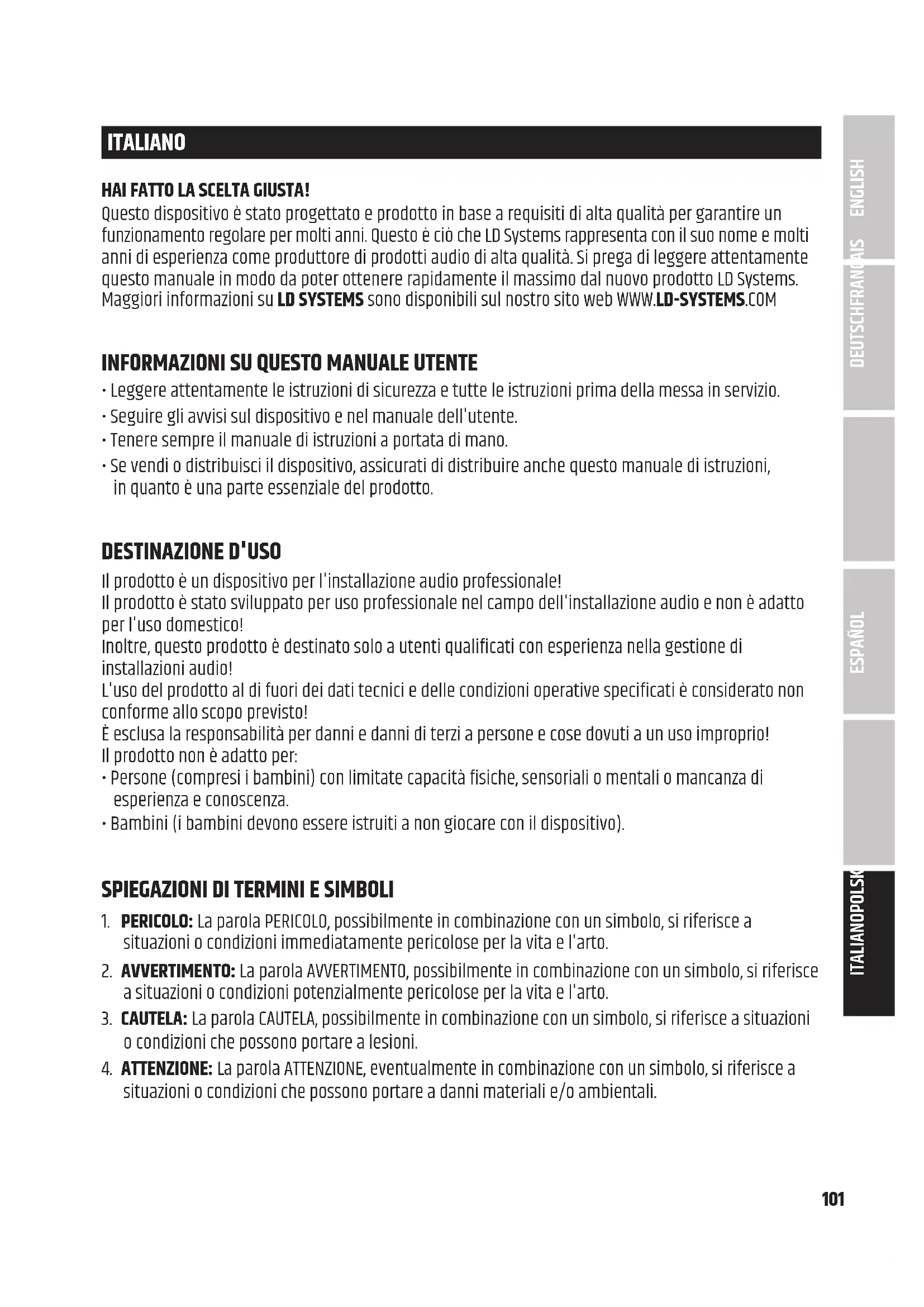 Adam Hall GmbH oświadcza niniejszym, że ten typ systemu radiowego jest zgodny z dyrektywą 2014/53/UE. Pełny tekst deklaracji zgodności UE znajduje się poniżej Dostępny adres internetowy: www.adamhall.com/compliance/ Błędy drukarskie i pomyłki, a także zmiany techniczne lub inne są zastrzeżone! ITALIANO POLSKI ESPAÑOL FRANCAIS DEUTSCHENGLISH101 ITALIANO HAI FATTO LA SCELTA GIUSTA! Questo dispositivo è stato progettato e prodotto in base a requisiti di alta qualità per garantire un funzionamento regolare per molti anni. Questo è ciò che LD Systems rappresenta con il suo nome e molti anni di esperienza come produttore di prodotti audio di alta qualità. Si prega di leggere attentamente questo manuale in modo da poter ottenere rapidamente il massimo dal nuovo prodotto LD Systems. Maggiori informazioni su LD SYSTEMS sono disponibili sul nostro sito web WWW.LD-SYSTEMS.COM