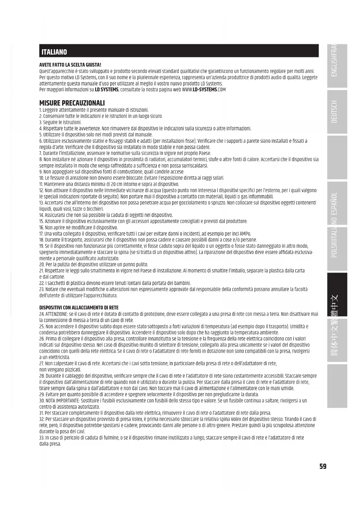 ITALIANO AVETE FATTO LA SCELTA GIUSTA! Quest‘apparecchio è stato sviluppato e prodotto secondo elevati standard qualitativi che garantiscono un funzionamento regolare per molti anni. Per questo motivo LD Systems, con il suo nome e la pluriennale esperienza, rappresenta un‘azienda produttrice di prodotti audio di qualità. Leggete attentamente questo manuale d‘uso per utilizzare al meglio il vostro nuovo prodotto LD Systems. Per maggiori informazioni su LD SYSTEMS, consultate la nostra pagina web WWW.LD-SYSTEMS.COM MISURE PRECAUZIONALI