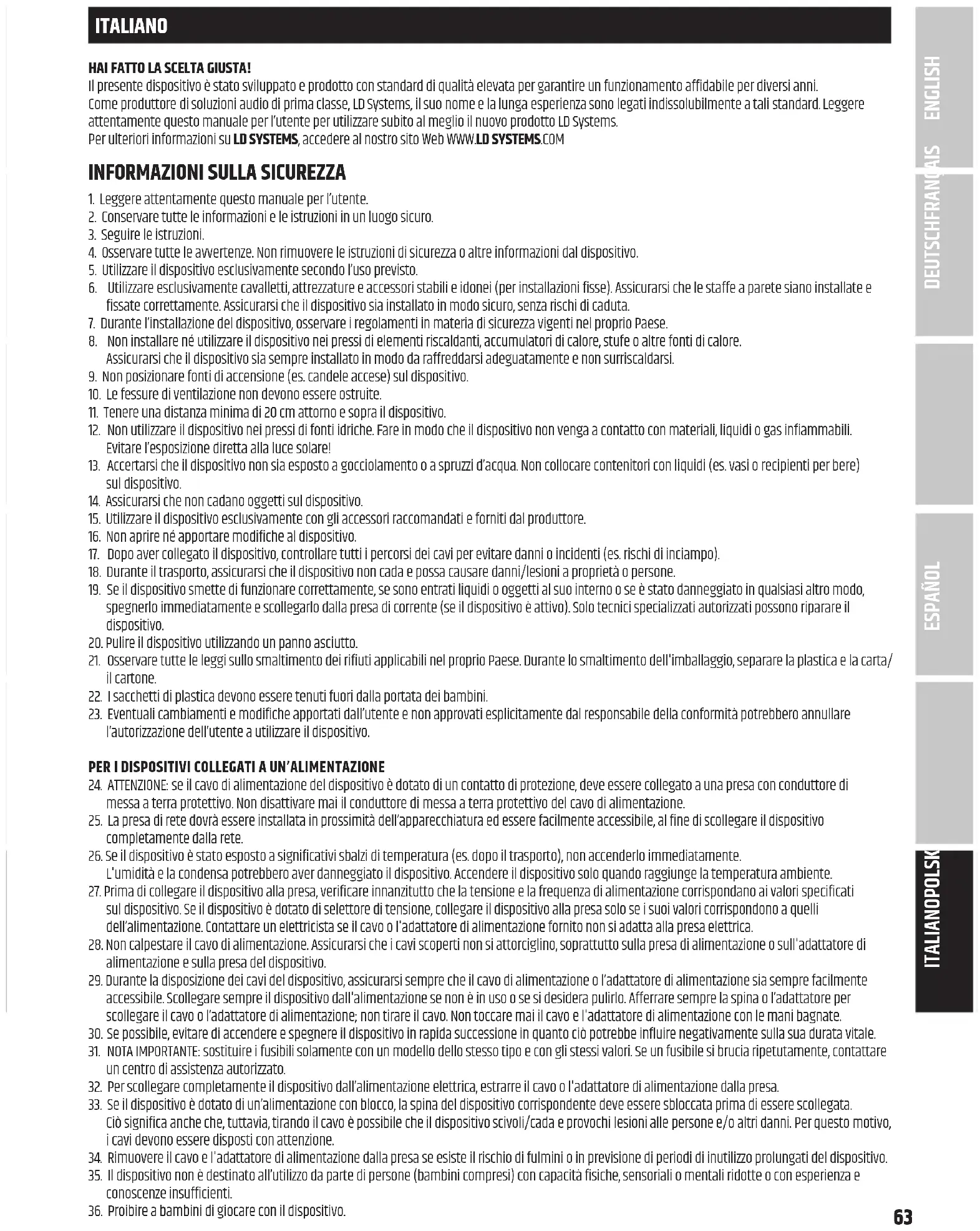 Per attivare la funzione di standby automatico, spostare il DIP switch 1 nella posizione ON. Se l’interruttore standby è attivato, l’amplificatore passerà automaticamente nella modalità standby (riduzione del consumo energetico) dopo circa 20 minuti di assenza di segnale audio. Se continua a non esserci segnale audio, la modalità standby termina automaticamente e l’amplificatore è pronto per funzionare nuovamente dopo circa tre secondi; il LED standby lampeggia in bianco durante questo periodo di tempo. Il LED STANDBY sulla parte anteriore del dispositivo è bianco durante il funzionamento normale e rosso quando è attivata la modalità standby. Inoltre, la modalità standby può essere interrotta manualmente premendo il pulsante standby sulla parte anteriore dell’amplificatore. DEUTSCHFRANÇAIS ESPAÑOL ENGLISH ITALIANO POLSKI68 DIP SWITCH 2 SW RESET (REIMPOSTAZIONE SOFTWARE) Per ripristinare completamente le impostazioni di fabbrica ed evitare sbalzi di volume dopo il processo di avvio, impostare tutti i DIP switch del dispositivo nella posizione OFF, l’interruttore a 3 vie per l’impostazione della modalità canale su ST (stereo) e ruotare i controlli di livello da CH1 a CH4 completamente in senso antiorario -∞ prima di iniziare la reimpostazione del software. Successivamente, avviare la reimpostazione del software seguendo questa procedura: A. Attivare la modalità standby del dispositivo (premere il pulsante standby n. 16) e attendere che l’indicatore LED STANDBY diventi rosso fisso. Quindi spegnere il dispositivo (interruttore numero 3 sul retro del dispositivo) e attendere che la visualizzazione del LED scompaia completamente. B. Spostare il DIP 2 SW RESET nella posizione ON. C. Riaccendere il dispositivo e attendere che il LED standby sulla parte anteriore diventi bianco fisso (per interrompere il processo di reimpostazione, ora spostare il DIP switch 2 SW RESET nella posizione OFF). D. Attivare la modalità standby del dispositivo e attendere che l’indicatore LED STANDBY diventi rosso fisso. Quindi spegnere il dispositivo e attendere che la visualizzazione del LED scompaia completamente. E. Spostare il DIP switch 2 SW RESET nella posizione OFF. F. Accendere il dispositivo; a questo punto il software è reimpostato. Durante il processo di reimpostazione, il dispositivo viene avviato completamente e quindi arrestato di nuovo. Il dispositivo viene quindi riavviato. Durante il riavvio, la reimpostazione è riuscita se i campi SIG e BRIDGE sulla parte anteriore del dispositivo si illuminano brevemente uno dopo l’altro. Non spegnere l’amplificatore durante la procedura al punto F e non modificare le impostazioni! DIP SWITCH 3 REM MODE (MODALITÀ REMOTA) Il DIP switch 3 REM MODE è riservato per l’integrazione di futuri accessori del bus remoto LD Systems. Informazioni più dettagliate sono disponibili nel manuale utente degli accessori aggiuntivi del bus remoto. Il DIP switch attualmente non ha alcuna funzione. DIP SWITCH 4 REM LOCK (BLOCCO REMOTO) Spostare il DIP switch 4 nella posizione ON per bloccare tutti gli elementi di controllo del dispositivo (controllo di livello, DIP switch, interruttore per modalità canale e pulsante STANDBY), il display LED REM LOCK si illumina permanentemente. Per sbloccare gli elementi di controllo, spostare il DIP switch nella posizione OFF. Il display LED si spegne, sempre che non siano state apportate modifiche agli elementi di controllo sul retro oppure non siano state apportate modifiche ai valori utilizzando il controllo Ethernet.