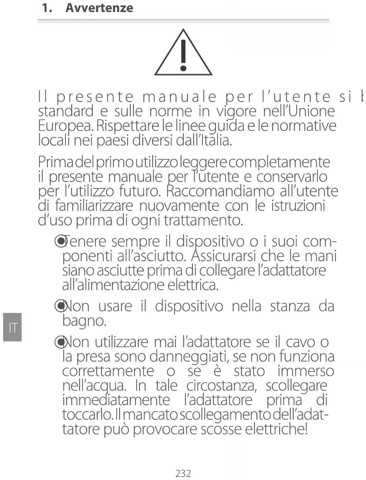 Tenere sempre il dispositivo o i suoi com- ponenti all’asciutto. Assicurarsi che le mani siano asciutte prima di collegare l’adattatore all’alimentazione elettrica.