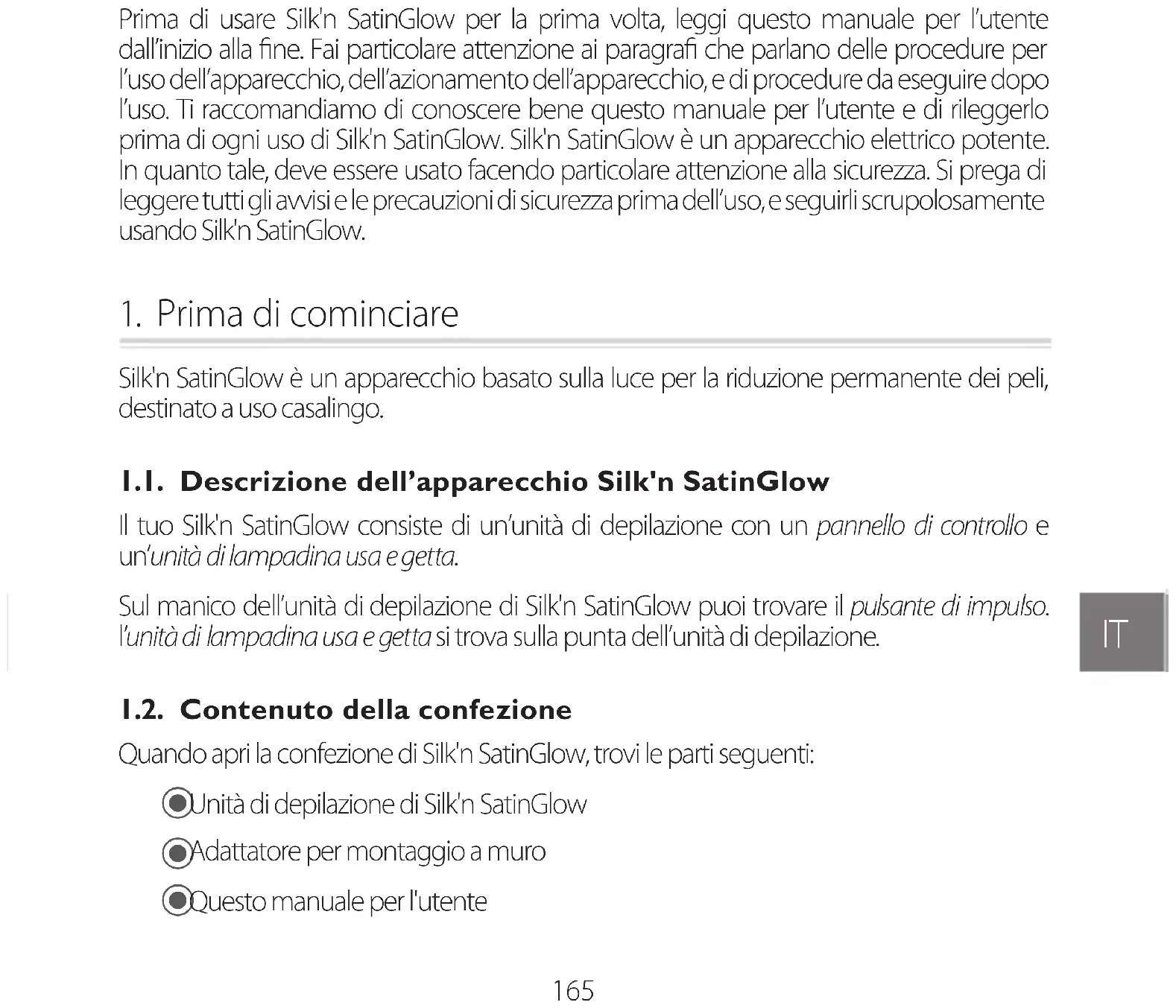 Prima di usare Silk'n SatinGlow per la prima volta, leggi questo manuale per l’utente dall’inizio alla ne. Fai particolare attenzione ai paragra che parlano delle procedure per l’uso dell’apparecchio, dell’azionamento dell’apparecchio, e di procedure da eseguire dopo l’uso. Ti raccomandiamo di conoscere bene questo manuale per l’utente e di rileggerlo prima di ogni uso di Silk'n SatinGlow. Silk'n SatinGlow è un apparecchio elettrico potente. In quanto tale, deve essere usato facendo particolare attenzione alla sicurezza. Si prega di leggere tutti gli avvisi e le precauzioni di sicurezza prima dell’uso, e seguirli scrupolosamente usando Silk'n SatinGlow.