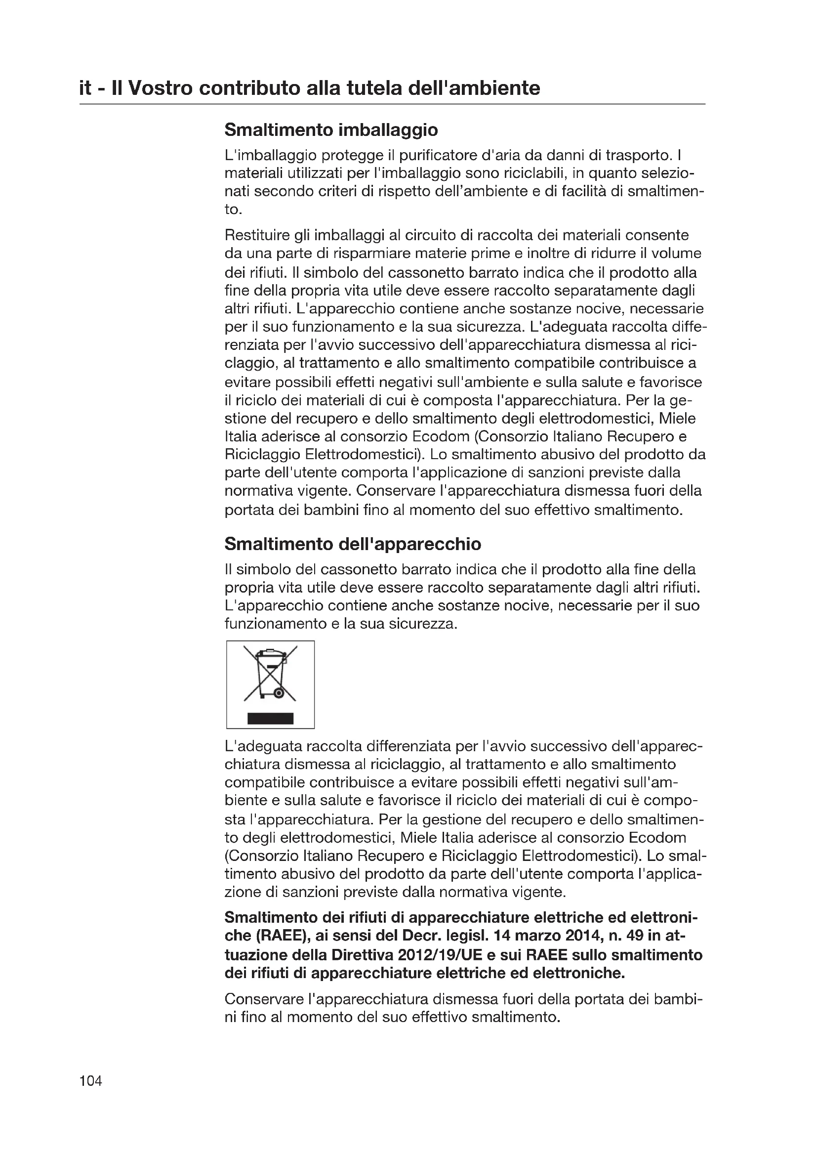 Smaltimento imballaggio L'imballaggio protegge il purificatore d'aria da danni di trasporto. I materiali utilizzati per l'imballaggio sono riciclabili, in quanto selezio- nati secondo criteri di rispetto dell’ambiente e di facilità di smaltimen- to. Restituire gli imballaggi al circuito di raccolta dei materiali consente da una parte di risparmiare materie prime e inoltre di ridurre il volume dei rifiuti. Il simbolo del cassonetto barrato indica che il prodotto alla fine della propria vita utile deve essere raccolto separatamente dagli altri rifiuti. L'apparecchio contiene anche sostanze nocive, necessarie per il suo funzionamento e la sua sicurezza. L'adeguata raccolta diffe- renziata per l'avvio successivo dell'apparecchiatura dismessa al rici- claggio, al trattamento e allo smaltimento compatibile contribuisce a evitare possibili effetti negativi sull'ambiente e sulla salute e favorisce il riciclo dei materiali di cui è composta l'apparecchiatura. Per la ge- stione del recupero e dello smaltimento degli elettrodomestici, Miele Italia aderisce al consorzio Ecodom (Consorzio Italiano Recupero e Riciclaggio Elettrodomestici). Lo smaltimento abusivo del prodotto da parte dell'utente comporta l'applicazione di sanzioni previste dalla normativa vigente. Conservare l'apparecchiatura dismessa fuori della portata dei bambini fino al momento del suo effettivo smaltimento. Smaltimento dell'apparecchio Il simbolo del cassonetto barrato indica che il prodotto alla fine della propria vita utile deve essere raccolto separatamente dagli altri rifiuti. L'apparecchio contiene anche sostanze nocive, necessarie per il suo funzionamento e la sua sicurezza. L'adeguata raccolta differenziata per l'avvio successivo dell'apparec- chiatura dismessa al riciclaggio, al trattamento e allo smaltimento compatibile contribuisce a evitare possibili effetti negativi sull'am- biente e sulla salute e favorisce il riciclo dei materiali di cui è compo- sta l'apparecchiatura. Per la gestione del recupero e dello smaltimen- to degli elettrodomestici, Miele Italia aderisce al consorzio Ecodom (Consorzio Italiano Recupero e Riciclaggio Elettrodomestici). Lo smal- timento abusivo del prodotto da parte dell'utente comporta l'applica- zione di sanzioni previste dalla normativa vigente. Smaltimento dei rifiuti di apparecchiature elettriche ed elettroni- che (RAEE), ai sensi del Decr. legisl. 14 marzo 2014, n. 49 in at- tuazione della Direttiva 2012/19/UE e sui RAEE sullo smaltimento dei rifiuti di apparecchiature elettriche ed elettroniche. Conservare l'apparecchiatura dismessa fuori della portata dei bambi- ni fino al momento del suo effettivo smaltimento.it - Il Vostro contributo alla tutela dell'ambiente
