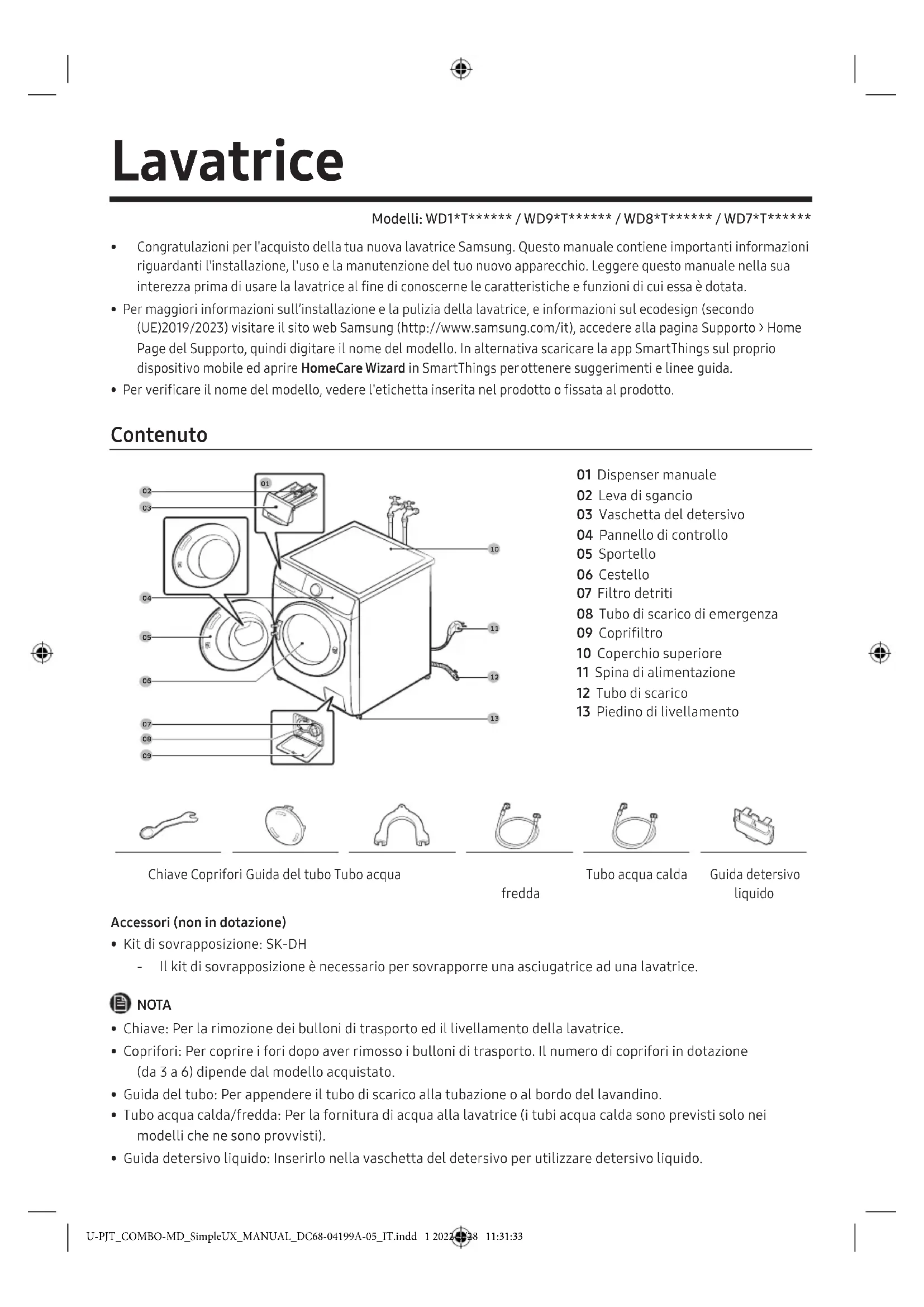 - Per maggiori informazioni sull’installazione e la pulizia della lavatrice, e informazioni sul ecodesign (secondo (UE)2019/2023) visitare il sito web Samsung (http://www.samsung.com/it), accedere alla pagina Supporto > Home Page del Supporto, quindi digitare il nome del modello. In alternativa scaricare la app SmartThings sul proprio dispositivo mobile ed aprire HomeCare Wizard in SmartThings per ottenere suggerimenti e linee guida.