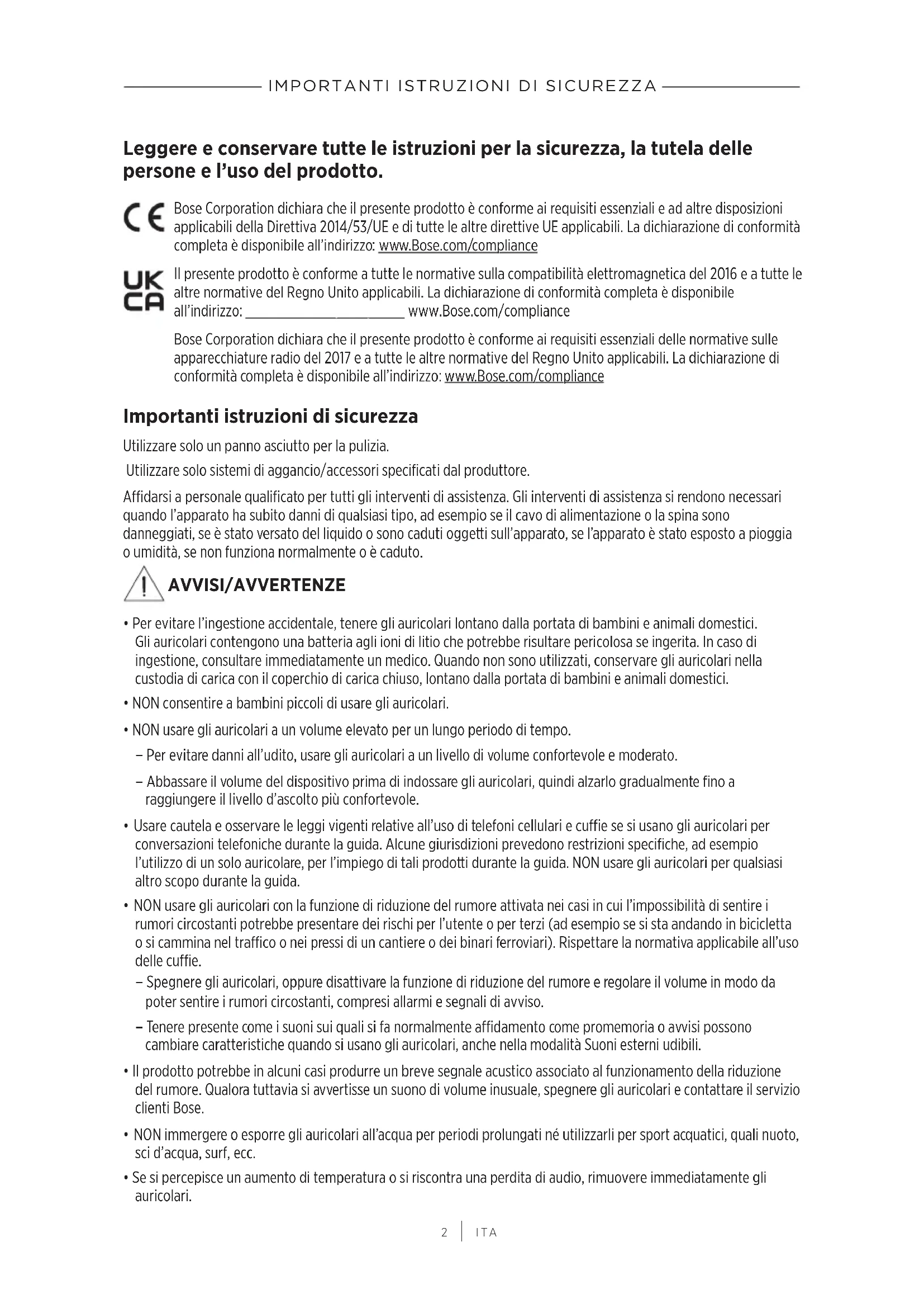 Bose Corporation dichiara che il presente prodotto è conforme ai requisiti essenziali delle normative sulle apparecchiature radio del 2017 e a tutte le altre normative del Regno Unito applicabili. La dichiarazione di conformità completa è disponibile all'indirizzo: www.Bose.com/compliance