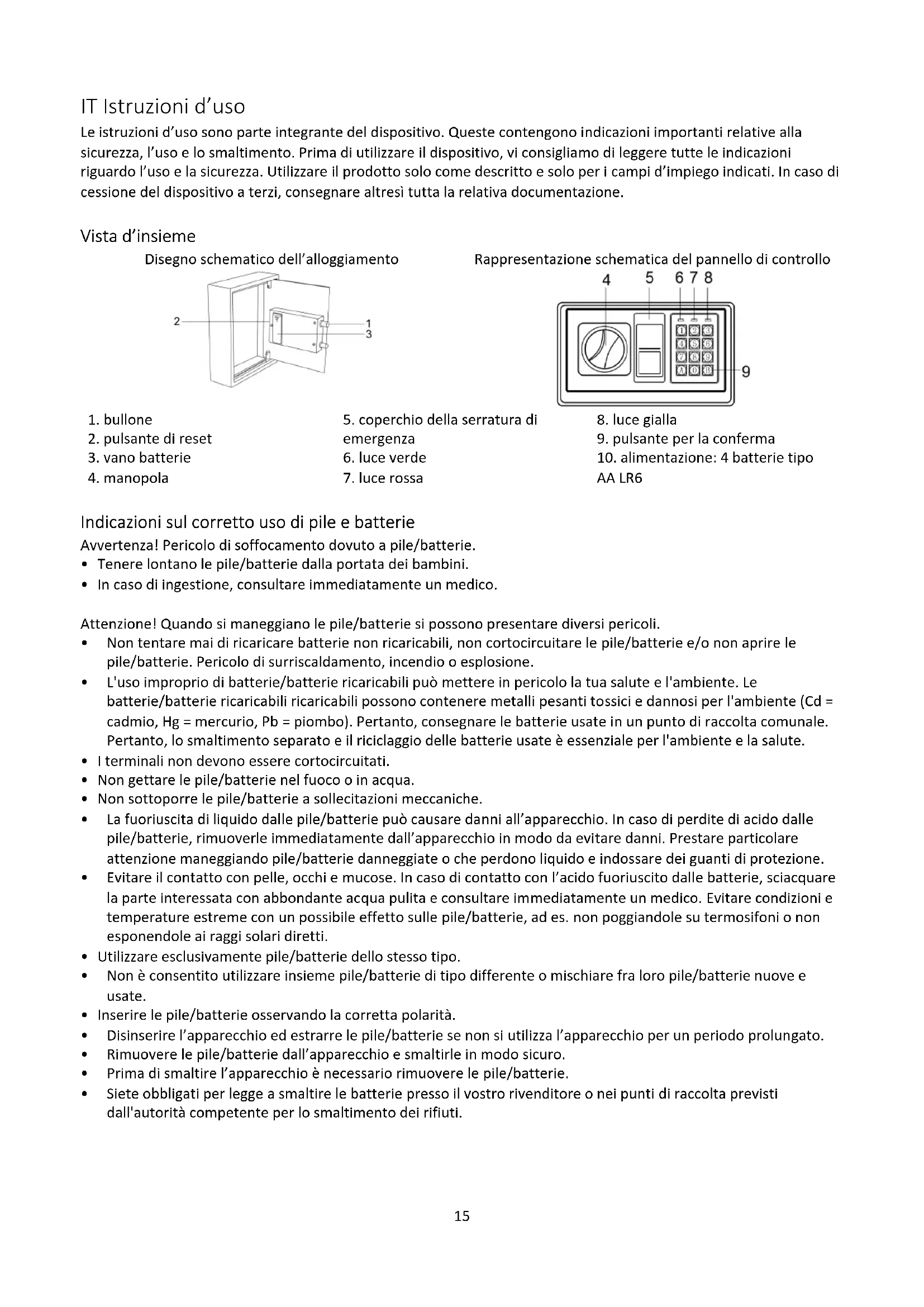 - Siete obbligati per legge a smaltire le batterie presso il vostro rivenditore o nei punti di raccolta previsti dall'autorità competente per lo smaltimento dei rifiuti.16 Contenuto della confezione Verificare il contenuto della confezione della cassaforte prima di usarla. In caso dovesse mancare qualcosa o risultare danneggiato, si prega di rivolgersi al nostro servizio di assistenza. 1 cassaforte 2 chiavi di emergenza 1 istruzioni d’uso Portachiavi