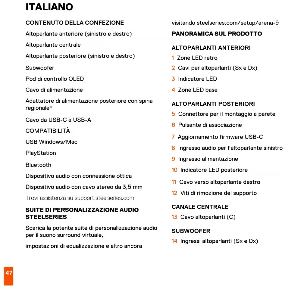 Altoparlante anteriore (sinistro e destro) Altoparlante centrale Altoparlante posteriore (sinistro e destro) Subwoofer Pod di controllo OLED Cavo di alimentazione Adattatore di alimentazione posteriore con spina regionale* Cavo da USB-C a USB-A COMPATIBILITÀ USB Windows/Mac PlayStation Bluetooth Dispositivo audio con connessione ottica Dispositivo audio con cavo stereo da 3,5 mm Trovi assistenza su support.steelseries.com
