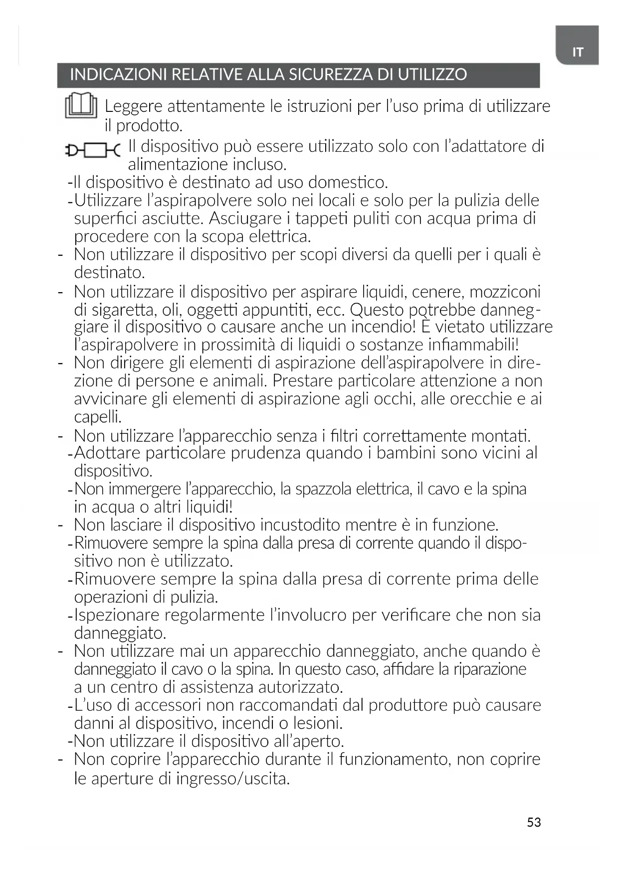 giare il disposivo o causare anche un incendio! È vietato ulizzare l’aspirapolvere in prossimità di liquidi o sostanze inammabili! - Non dirigere gli elemen di aspirazione dell’aspirapolvere in dire