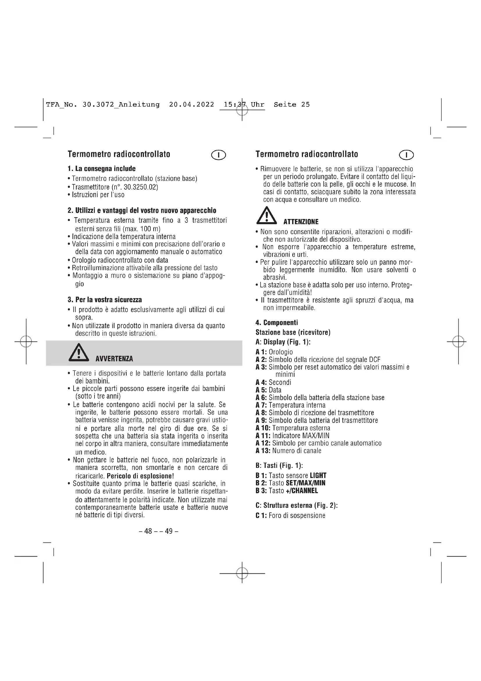 Stazione base (ricevitore) A: Display (Fig. 1): A 1: Orologio A 2: Simbolo della ricezione del segnale DCF A 3: Simbolo per reset automatico dei valori massimi e minimi A 4: Secondi A 5: Data A 6: Simbolo della batteria della stazione base A 7: Temperatura interna A 8: Simbolo di ricezione del trasmettitore A 9: Simbolo della batteria del trasmettitore A 10: Temperatura esterna A 11: Indicatore MAX/MIN A 12: Simbolo per cambio canale automatico A 13: Numero di canale B: Tasti (Fig. 1): B 1: Tasto sensore LIGHT B 2: Tasto SET/MAX/MIN B 3: Tasto +/CHANNEL C: Struttura esterna (Fig. 2): C 1: Foro di sospensione TFA_No. 30.3072_Anleitung 20.04.2022 15:37 Uhr Seite 25– 50 – – 51 – Termometro radiocontrollato