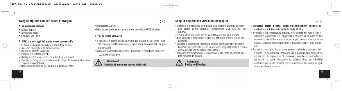 - La batteria non può e non deve essere sostituita o rimossa dal- l'utente. La sostituzione impropria della batteria può comportare un rischio di esplosione. Il personale qualificato può ottenere istruzioni su come rimuovere la batteria fissa su info@tfa- dostmann.de, se ciò dovesse essere necessario allo scopo di ripa- rare o riciclare il prodotto. TFA_No. 60.2032_Anleitung 02.05.2022 11:06 Uhr Seite 255150 Sveglia digitale con vari suoni di sveglia