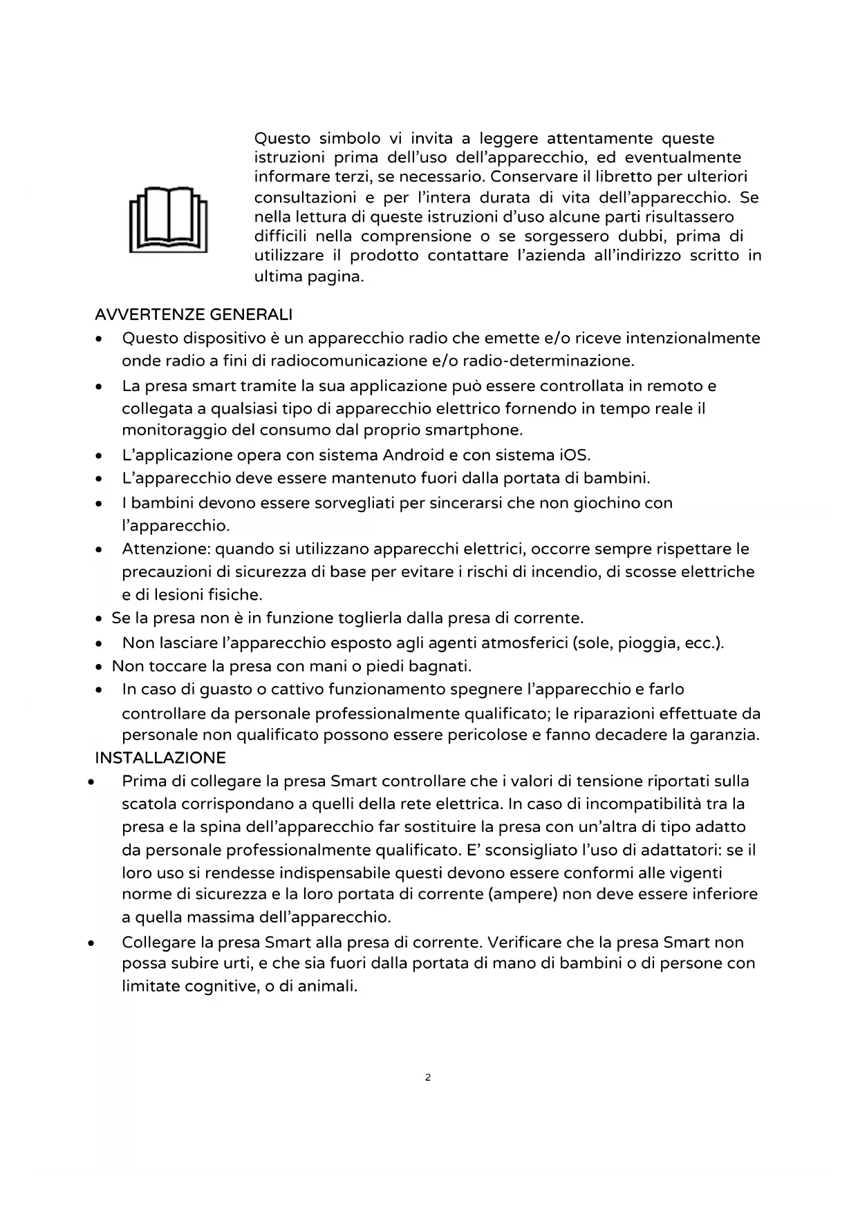 - Prima di collegare la presa Smart controlling che i valori di tensione riportati sulla scatola corrispondano a quelli della rete elettrica. In caso di incompatibilità tra la presa e la spina dell'apparecchio far sostuire la presa con un'altra di tipo adatto da personale professionlmente qualificato. E' sconsigliato l'uso di adattatori: se il loro uso si rendesse indispensable questi devono essere conformi alle vigenti norme di sicurezza e la loro portata di corrente (ampere) non delve essere inferiore a quella massima dell'apparecchio.
