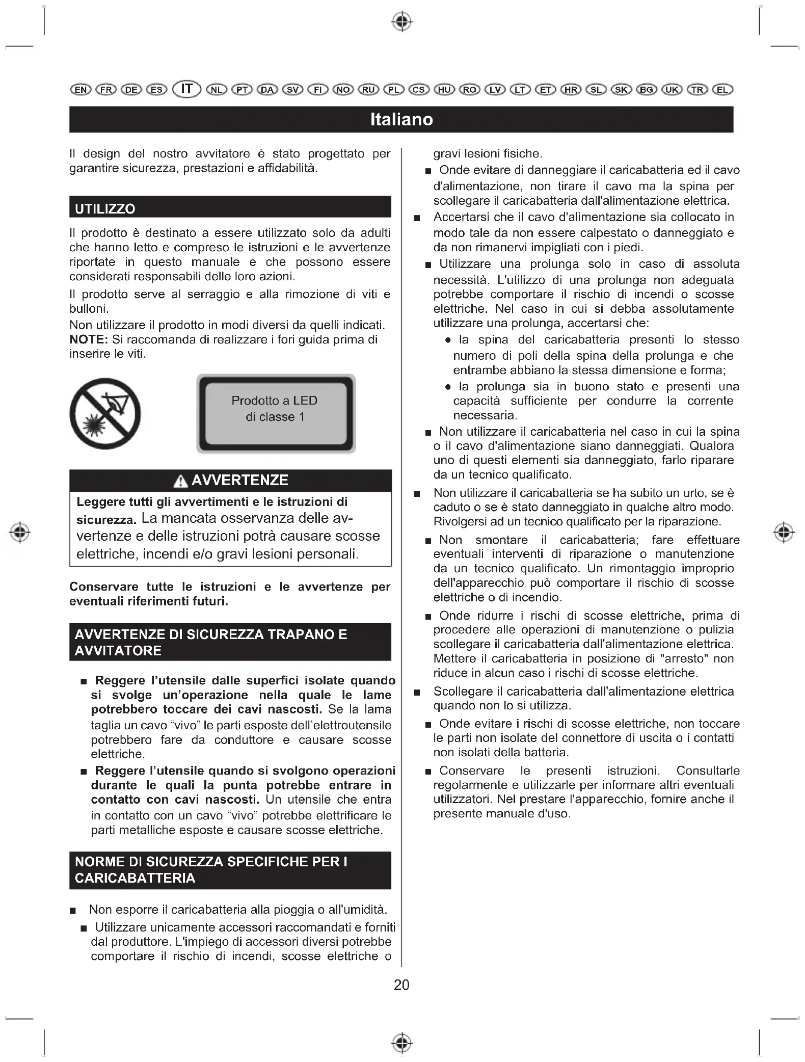 EN FR DE ES NL PT DA SV FI NO RU PL CS HU RO LV LT ET HR SL SK UKBG TR EL Il design del nostro avvitatore è stato progettato per garantire sicurezza, prestazioni e affidabilità. UTILIZZO Il prodotto è destinato a essere utilizzato solo da adulti che hanno letto e compreso le istruzioni e le avvertenze riportate in questo manuale e che possono essere considerati responsabili delle loro azioni. Il prodotto serve al serraggio e alla rimozione di viti e bulloni. Non utilizzare il prodotto in modi diversi da quelli indicati. NOTE: Si raccomanda di realizzare i fori guida prima di inserire le viti. Prodotto a LED di classe 1 AVVERTENZE Leggere tutti gli avvertimenti e le istruzioni di sicurezza. La mancata osservanza delle av- vertenze e delle istruzioni potrà causare scosse HOHWWULFKHLQFHQGLHRJUDYLOHVLRQLSHUVRQDOL Conservare tutte le istruzioni e le avvertenze per eventuali riferimenti futuri.