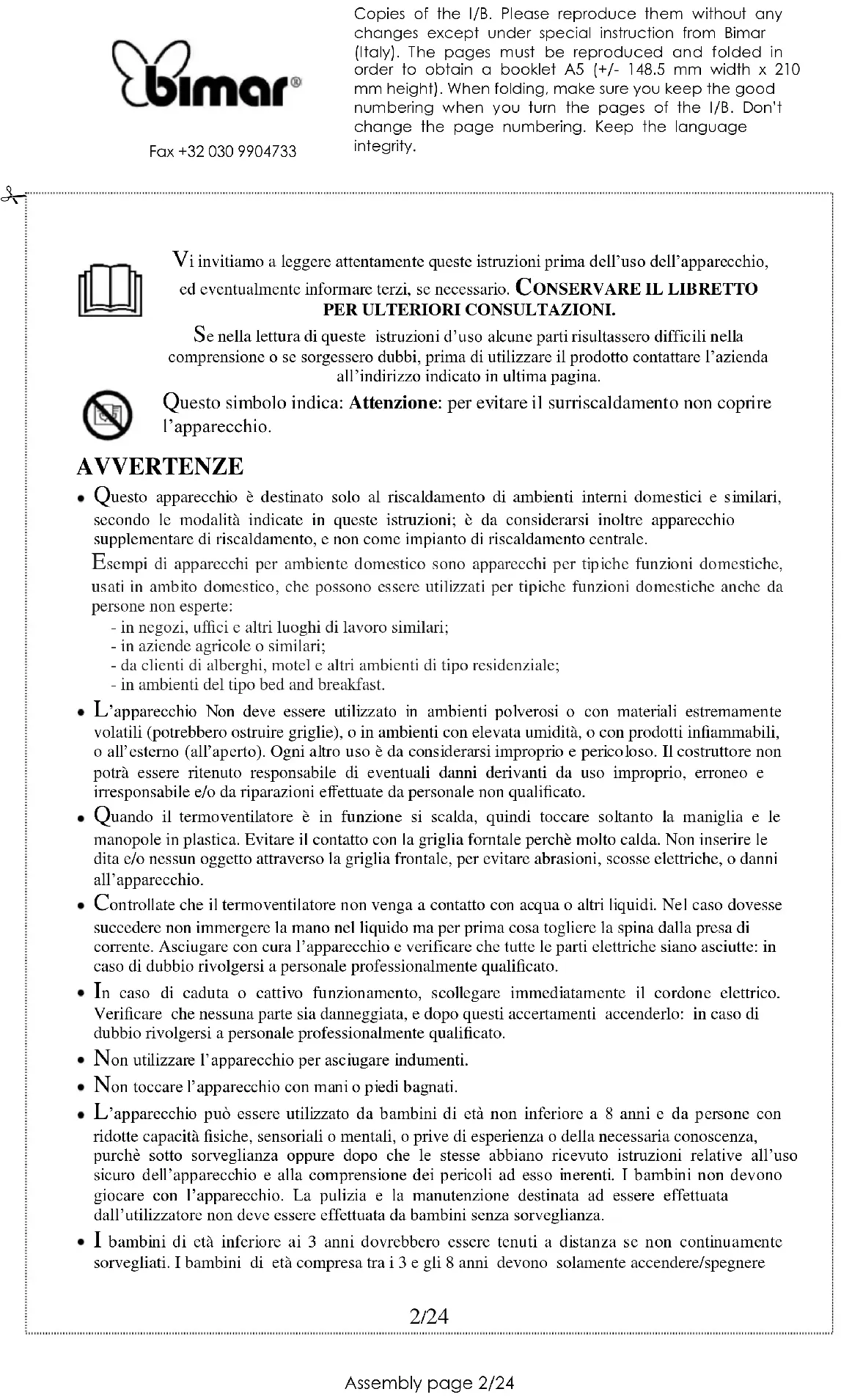 - Per lunghi periodi di inattività del termoventilatore, è necessario coprirlo e riporlo in un luogo asciutto; è consigliabile inserirlo nell'imballo originale per proteggerlo alla polvere e dall'umidità.