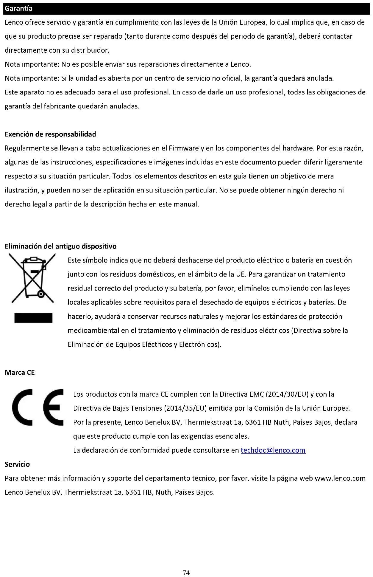 I prodotti con il marchio CE sono conformi alla Direttiva EMC (2014/30/UE) e alla Direttiva Bassa Tensione (2014/35/UE) emanate dalla Commissione della Comunità Europea. Con la presente, Lenco Benelux BV, Thermiekstraat 1a, 6361 HB Nuth, Paesi Bassi, dichiara che questo prodotto è conforme ai requisiti essenziali. La dichiarazione di conformità può essere consultata a techdoc@lenco.com Assistenza Per ulteriori informazioni e accesso all’helpdesk, visitare il sito www.lenco.com Lenco Benelux BV, Thermiekstraat 1a, 6361 HB, Nuth, Paesi Bassi.