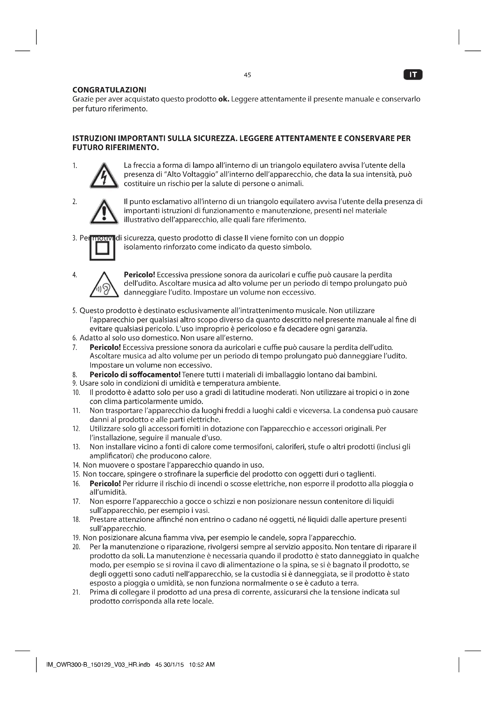 CONGRATULAZIONI Grazie per aver acquistato questo prodotto ok. Leggere attentamente il presente manuale e conservarlo per futuro riferimento. ISTRUZIONI IMPORTANTI SULLA SICUREZZA. LEGGERE ATTENTAMENTE E CONSERVARE PER FUTURO RIFERIMENTO.