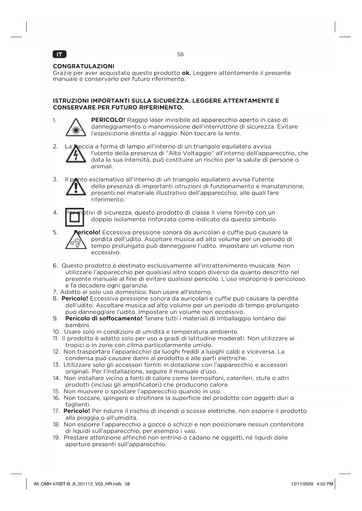 Rimuovere accuratamente il prodotto e gli accessori dalla confezione originale. Ispezionare i contenuti della consegna per verificarne la completezza e l’eventuale presenza di danni. Nel caso in cui il contenuto sia ncompleto o danneggiato, contattare immediatamente il punto vendita. IM_OMH 470BT-B_A_201112_V03_HR.indb 60IM_OMH 470BT-B_A_201112_V03_HR.indb 60 12/11/2020 4:52 PM12/11/2020 4:52 PM61