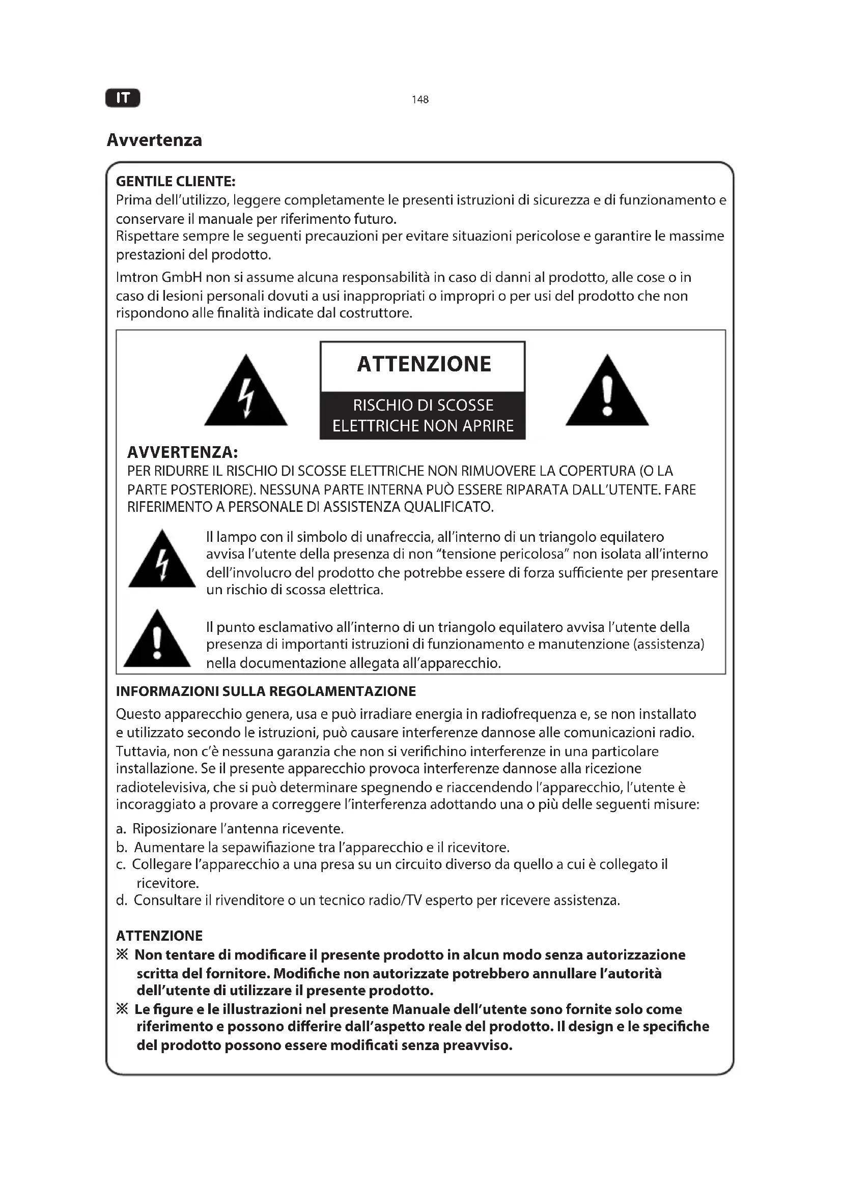 GENTILE CLIENTE: Prima dell’utilizzo, leggere completamente le presenti istruzioni di sicurezza e di funzionamento e conservare il manuale per riferimento futuro. Rispettare sempre le seguenti precauzioni per evitare situazioni pericolose e garantire le massime prestazioni del prodotto. Imtron GmbH non si assume alcuna responsabilità in caso di danni al prodotto, alle cose o in caso di lesioni personali dovuti a usi inappropriati o impropri o per usi del prodotto che non rispondono alle nalità indicate dal costruttore. Avvertenza AVVERTENZA: PER RIDURRE IL RISCHIO DI SCOSSE ELETTRICHE NON RIMUOVERE LA COPERTURA (O LA PARTE POSTERIORE). NESSUNA PARTE INTERNA PUÒ ESSERE RIPARATA DALL’UTENTE. FARE RIFERIMENTO A PERSONALE DI ASSISTENZA QUALIFICATO. Il lampo con il simbolo di unafreccia, all’interno di un triangolo equilatero avvisa l’utente della presenza di non “tensione pericolosa” non isolata all’interno dell’involucro del prodotto che potrebbe essere di forza suciente per presentare un rischio di scossa elettrica. Il punto esclamativo all’interno di un triangolo equilatero avvisa l’utente della presenza di importanti istruzioni di funzionamento e manutenzione (assistenza) nella documentazione allegata all’apparecchio.