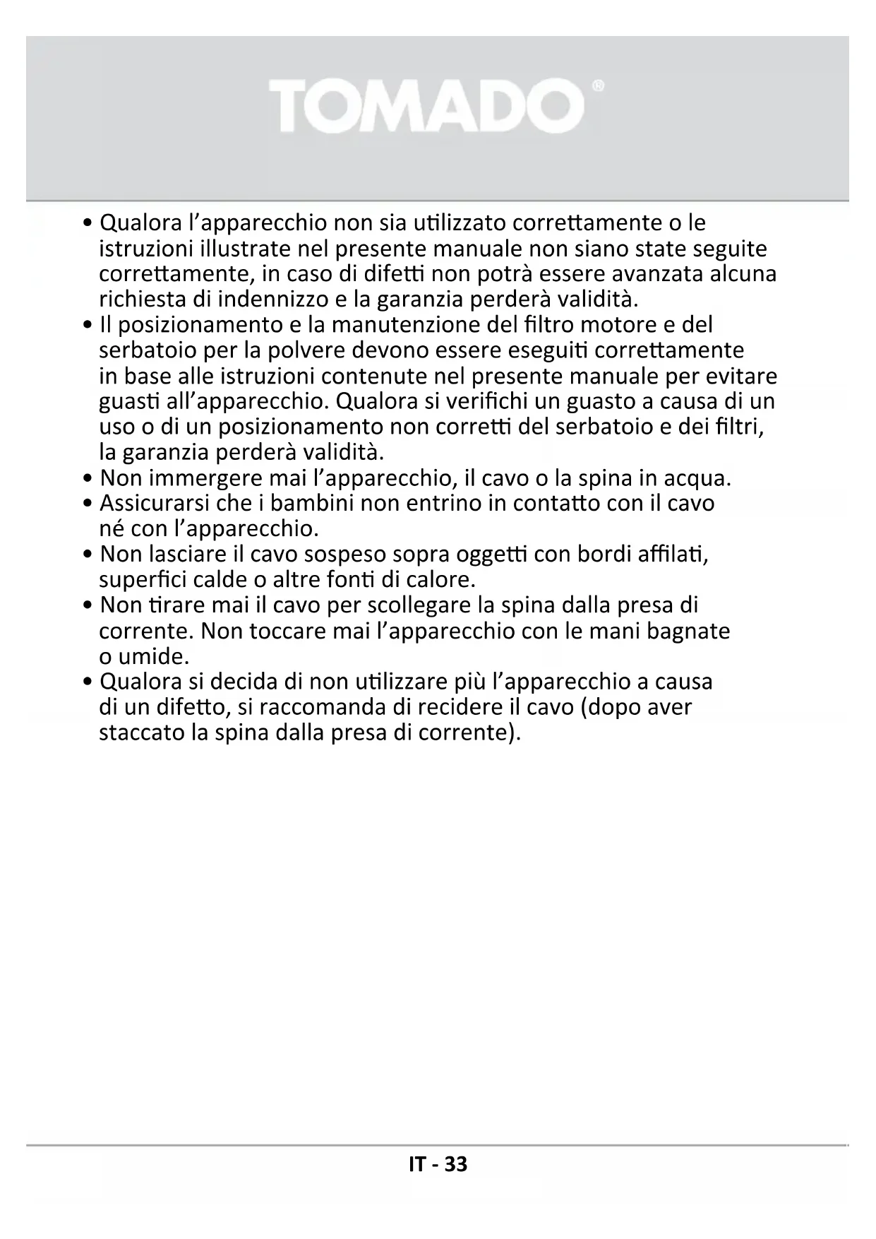 - Qualorasidecidadinonulizzarepiùl’apparecchioacausa diundifeo,siraccomandadirecidereilcavo(dopoaver staccatolaspinadallapresadicorrente). IT - 33IT - 34