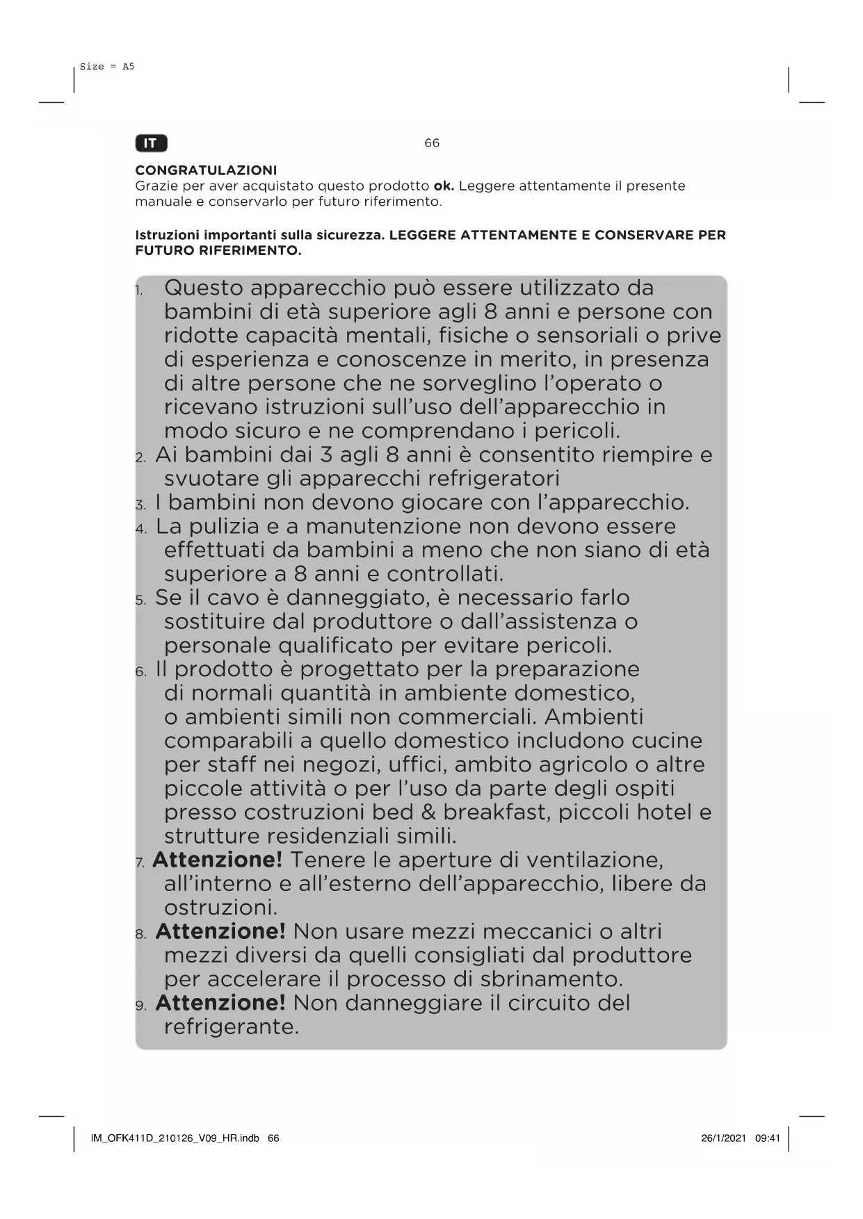 - Verdure, frutta, pollame, manzo: 6-12 mesi SMALTIMENTO Non smaltire questi apparecchi con i rifiuti domestici. Consegnarlo presso un punto di raccolta per il riciclo WEEE. Così aiutate a risparmiare le risorse ed a proteggere l’ambiente. Contattare le autorità o il rivenditore locale per ulteriori informazioni. I refrigeranti devono essere evacuati e smaltiti da un tecnico qualificato in conformità con le normative federali e locali prima che l’apparecchio venga raschiato. IM_OFK411D_210126_V09_HR.indb 75IM_OFK411D_210126_V09_HR.indb 75 26/1/2021 09:4126/1/2021 09:4176 Size = A5