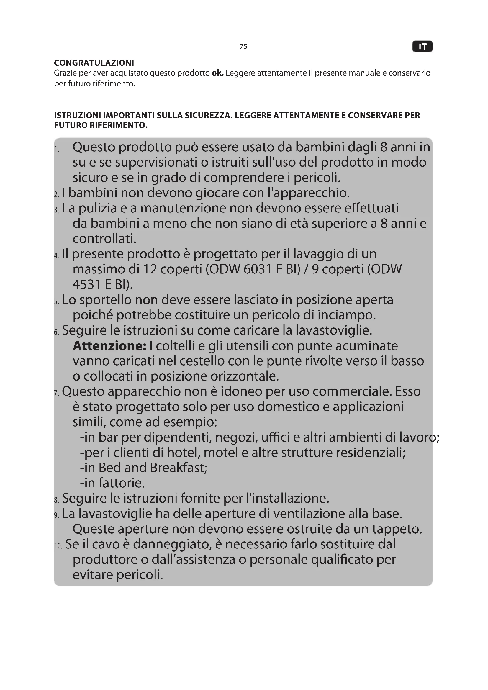 Scarica le istruzioni per il tuo Lavastoviglie in formato PDF gratuitamente! Trova il tuo manuale ODW 4531 E BI - OK e riprendi in mano il tuo dispositivo elettronico. In questa pagina sono pubblicati tutti i documenti necessari per l'utilizzo del tuo dispositivo. ODW 4531 E BI del marchio OK.