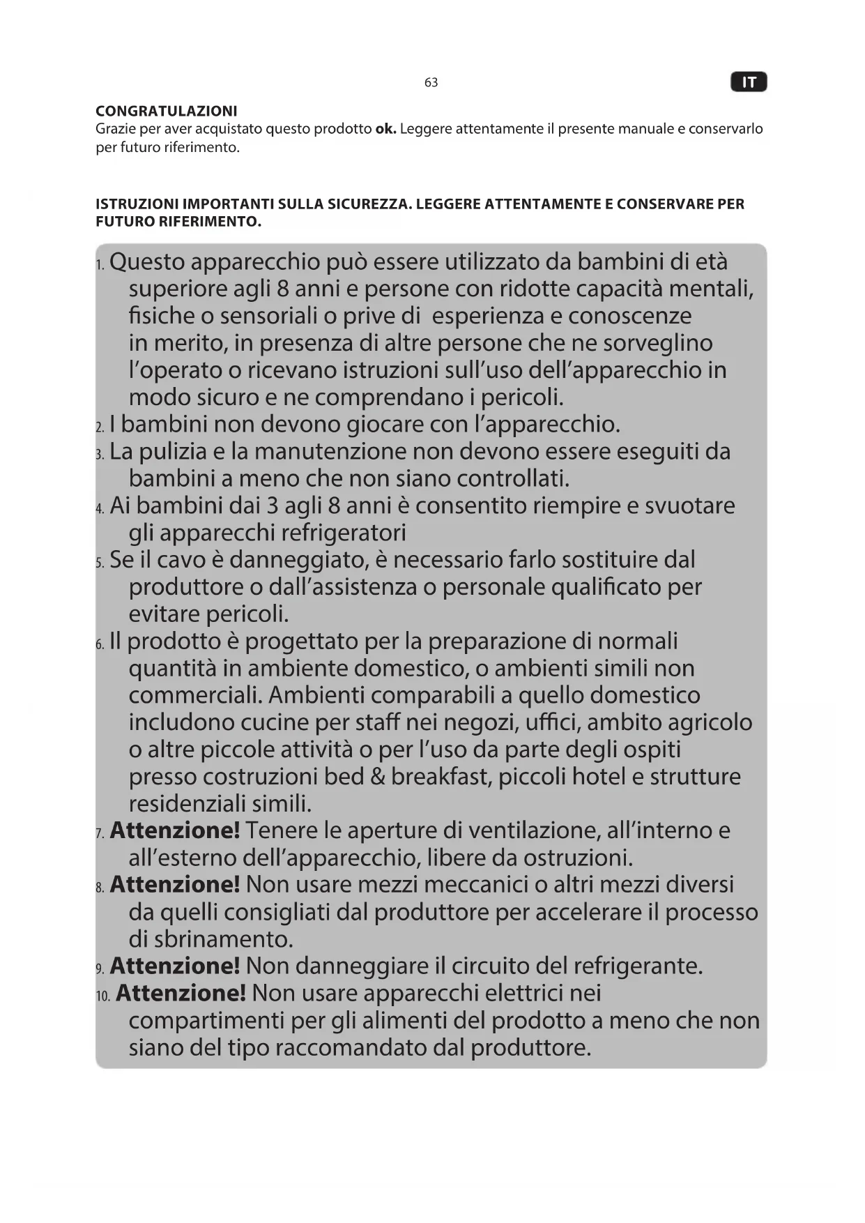 Attenzione: rischio di incendio! Materiali inammabili. ATTENZIONE! Durante l'uso, la manutenzione e lo smaltimento dell'apparecchio, prestare attenzione al simbolo sul lato sinistro, che si trova sul retro dell'apparecchio (pannello posteriore o compressore. E' il simbolo di pericolo d'incendio. Ci sono materiali inammabili nelle tubazioni del refrigerante e nel compressore. Per favore, stai lontano da una fonte d'incendio durante l'uso, la manutenzione e lo smaltimento. USO PREVISTO Questo prodotto è adatto esclusivamente per la conservazione in frigorifero e il congelamento di cibo e bevande. Qualsiasi altro uso può danneggiare il prodotto e causare lesioni. - Questo prodotto non è concepito per essere utilizzato come apparecchio da incasso. - Questo prodotto per refrigerazione è progettato per essere utilizzato a temperature ambiente comprese tra 10°C e 43°C. Questo prodotto è progettato esclusivamente per l’uso domestico e non è destinato all’uso commerciale. Imtron GmbH non si assume alcuna responsabilità in caso di danni al prodotto, alle cose o in caso di lesioni personali dovuti a usi inappropriati o impropri , o per usi del prodotto che non rispondono alle nalità indicate dal costruttore.66
