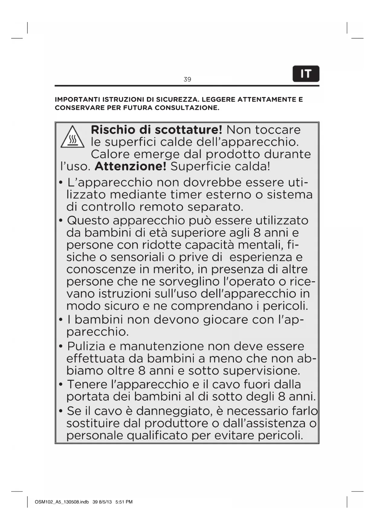 Durante la produzione, parti dell’apparecchio sono rivestite con uno strato oleoso per la loro protezione. Per rimuovere i residui di produzione, far funzionare l’apparecchio per ca. 10 min. senza alimenti. Assicurarsi che ci sia una ventilazione suciente in quanto potrebbe generarsi cattivo odore e fumo. Ciò è innocuo e sparirà a breve. OSM102_A5_130508.indb 42 8/5/13 5:51 PM43 Size - A5