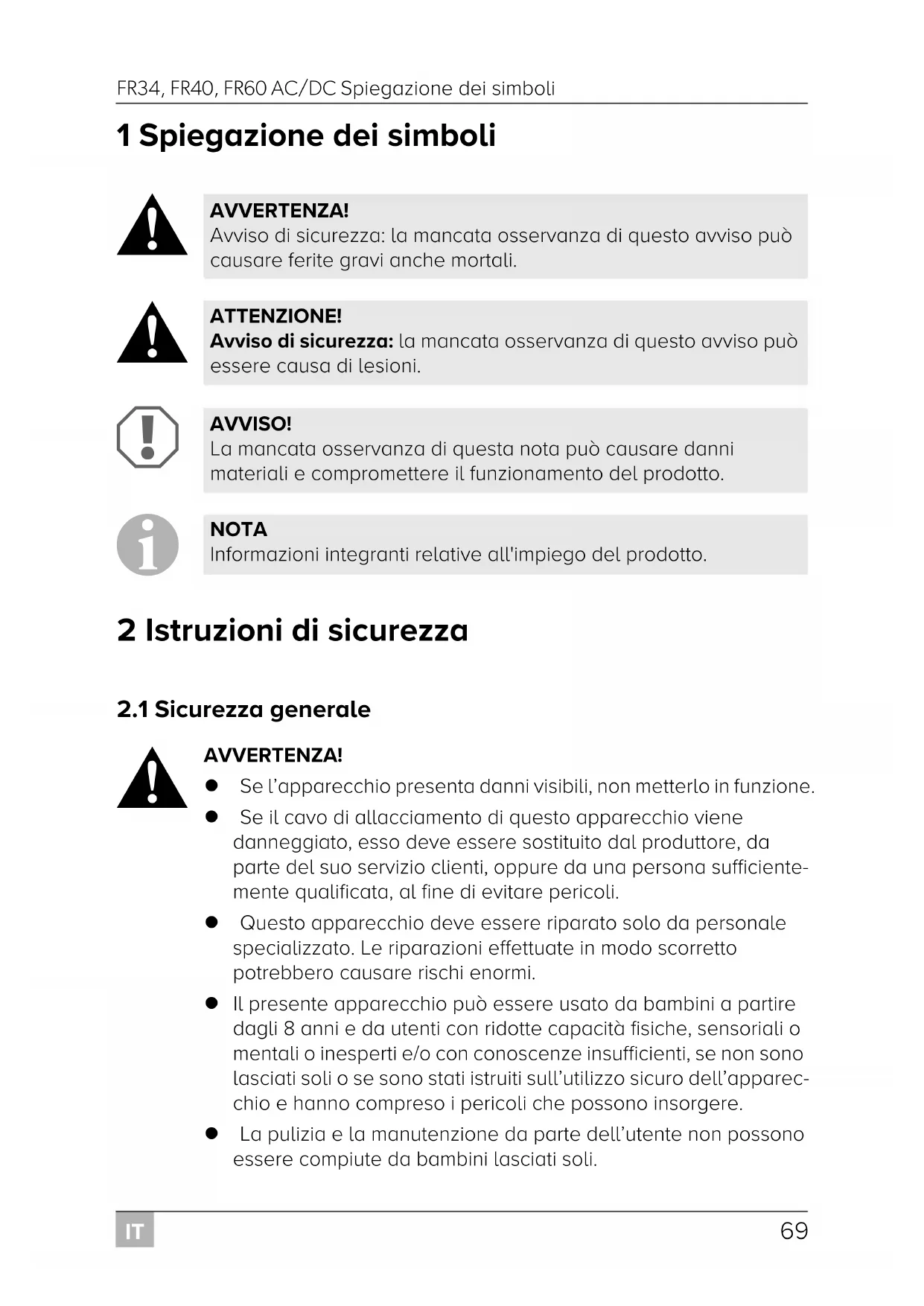 AVVERTENZA! Se l’apparecchio presenta danni visibili, non metterlo in funzione. Se il cavo di allacciamento di questo apparecchio viene danneggiato, esso deve essere sostituito dal produttore, da parte del suo servizio clienti, oppure da una persona sufficiente- mente qualificata, al fine di evitare pericoli. Questo apparecchio deve essere riparato solo da personale specializzato. Le riparazioni effettuate in modo scorretto potrebbero causare rischi enormi. Il presente apparecchio può essere usato da bambini a partire dagli 8 anni e da utenti con ridotte capacità fisiche, sensoriali o mentali o inesperti e/o con conoscenze insufficienti, se non sono lasciati soli o se sono stati istruiti sull’utilizzo sicuro dell’apparec- chio e hanno compreso i pericoli che possono insorgere. La pulizia e la manutenzione da parte dell’utente non possono essere compiute da bambini lasciati soli. AVVERTENZA! Avviso di sicurezza: la mancata osservanza di questo avviso può causare ferite gravi anche mortali. ATTENZIONE! Avviso di sicurezza: la mancata osservanza di questo avviso può essere causa di lesioni. AVVISO! La mancata osservanza di questa nota può causare danni materiali e compromettere il funzionamento del prodotto. NOTA Informazioni integranti relative all'impiego del prodotto. FR34-FR40-FR60--O-16s.book Seite 69 Donnerstag, 19. Juli 2018 3:22 15IT Istruzioni di sicurezza FR34, FR40, FR60 AC/DC
