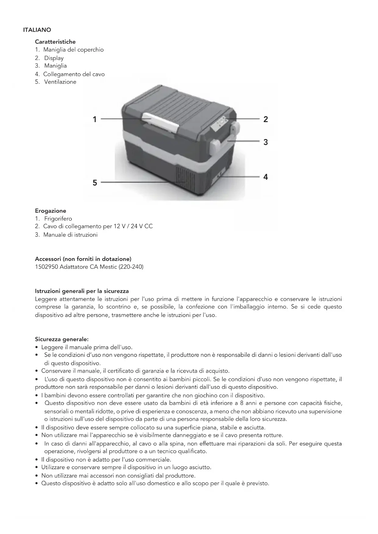 Accessori (non forniti in dotazione) 1502950 Adattatore CA Mestic (220-240) Istruzioni generali per la sicurezza Leggere attentamente le istruzioni per l'uso prima di mettere in funzione l'apparecchio e conservare le istruzioni comprese la garanzia, lo scontrino e, se possibile, la confezione con l'imballaggio interno. Se si cede questo dispositivo ad altre persone, trasmettere anche le istruzioni per l'uso. Sicurezza generale: