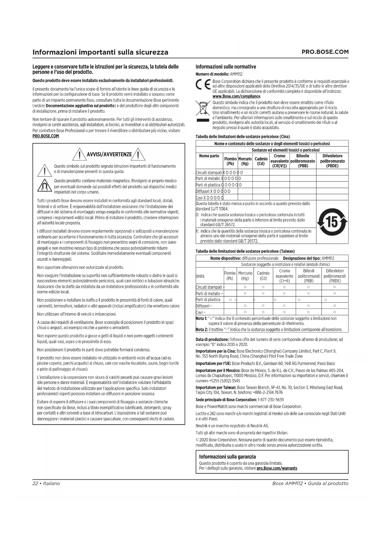 Nota 1: “○” indica che il contenuto percentuale delle sostanze soggette a limitazioni non supera il valore di presenza della percentuale di riferimento. Nota 2: il trattino “−” indica che la sostanza soggetta a limitazioni corrisponde all’esenzione. Data di produzione: l’ottava cifra del numero di serie corrisponde all’anno di produzione; ad esempio “0” indica 2010 o 2020. Importatore per la Cina: Bose Electronics (Shanghai) Company Limited, Part C, Plant 9, No.353 North Riying Road, China (Shanghai) Pilot Free Trade Zone Importatore per l’UE: Bose Products B.V., Gorslaan 60, 1441 RG Purmerend, Paesi Bassi Importatore per il Messico: Bose de México, S. de R.L. de C.V., Paseo de las Palmas 405-204, Lomas de Chapultepec, 11000 Messico, D.F. Per informazioni su importatori e servizi, chiamare il numero +5255 (5202) 3545 Importatore per Taiwan: Bose Taiwan Branch, 9F-A1, No. 10, Section 3, Minsheng East Road, Taipei City 104, Taiwan. N. telefono: +886-2-2514 7676 Sede principale di Bose Corporation: 1-877-230-5639 Bose e PowerMatch sono marchi commerciali di Bose Corporation. Loctite e 242 sono marchi e/o marchi registrati di Henkel e/o delle sue consociate negli Stati Uniti e in altri Paesi. Neutrik è un marchio registrato di Neutrik AG. Tutti gli altri marchi sono di proprietà dei rispettivi titolari. © 2020 Bose Corporation. Nessuna parte di questo documento può essere riprodotta, modificata, distribuita o usata in altro modo senza previa autorizzazione scritta. Informazioni sulla garanzia Questo prodotto è coperto da una garanzia limitata. Per i dettagli sulla garanzia, visitare pro.Bose.com/warranty. AVVISI/AVVERTENZE Questo simbolo sul prodotto segnala istruzioni importanti di funzionamento e di manutenzione presenti in questa guida. Questo prodotto contiene materiale magnetico. Rivolgersi al proprio medico per eventuali domande sui possibili eetti del prodotto sui dispositivi medici impiantati nel corpo umano. Tutti i prodotti Bose devono essere installati in conformità agli standard locali, statali, federali e di settore. È responsabilità dell’installatore assicurare che l’installazione dei diusori e del sistema di montaggio venga eseguita in conformità alle normative vigenti, compresi i regolamenti edilizi locali. Prima di installare il prodotto, chiedere informazioni all’autorità locale preposta. I diusori installati devono essere regolarmente ispezionati e sottoposti a manutenzione ordinaria per accertarne il funzionamento in tutta sicurezza. Controllare che gli accessori di montaggio e i componenti di fissaggio non presentino segni di corrosione, non siano piegati e non mostrino nessun tipo di problema che possa potenzialmente ridurre l’integrità strutturale del sistema. Sostituire immediatamente eventuali componenti usurati o danneggiati. Non apportare alterazioni non autorizzate al prodotto. Non eseguire l’installazione su superfici non sucientemente robuste o dietro le quali si nascondono elementi potenzialmente pericolosi, quali cavi elettrici o tubazioni idrauliche. Assicurarsi che la staa sia installata da un installatore professionista e in conformità alle norme edilizie locali. Non posizionare o installare la staa o il prodotto in prossimità di fonti di calore, quali caminetti, termosifoni, radiatori o altri apparati (inclusi amplificatori) che emettano calore. Non utilizzare all’interno di veicoli o imbarcazioni. A causa dei requisiti di ventilazione, Bose sconsiglia di posizionare il prodotto in spazi chiusi o angusti, ad esempio nicchie a parete o armadietti. Non esporre questo prodotto a gocce o getti di liquidi e non porre oggetti contenenti liquidi, quali vasi, sopra o in prossimità di esso. Non posizionare il prodotto in punti dove potrebbe formarsi condensa. Il prodotto non deve essere installato né utilizzato in ambienti vicini all’acqua (ad es. piscine coperte, parchi acquatici al chiuso, sale con vasche riscaldate, saune, bagni turchi e piste di pattinaggio al chiuso). L’installazione o la sospensione non sicura di carichi pesanti può causare gravi lesioni alle persone e danni materiali. È responsabilità dell’installatore valutare l’adabilità del metodo di installazione utilizzato per l’applicazione specifica. Solo installatori professionisti esperti possono installare un diusore in posizione sospesa. Evitare di esporre il diusore o i suoi componenti di fissaggio a sostanze chimiche non specificate da Bose, inclusi a titolo esemplificativo lubrificanti, detergenti, spray per contatti e altri solventi a base di idrocarburi. L’esposizione a tali sostanze può danneggiare i materiali plastici e causare spaccature, con conseguenti rischi di caduta.Italiano • 23Guida al prodotto • Bose AMM112