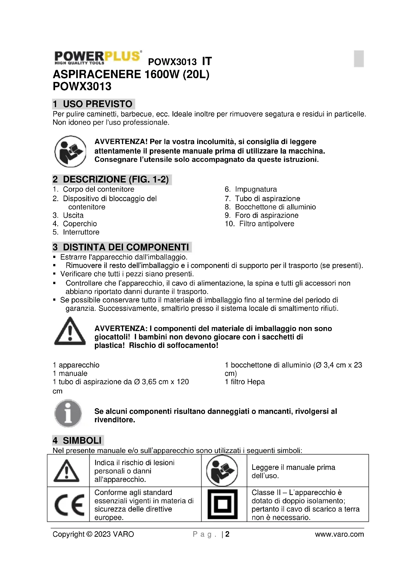 Copyright © 2023 VARO P a g . | 2 www.varo.com ASPIRACENERE 1600W (20L) POWX3013 1 USO PREVISTO Per pulire caminetti, barbecue, ecc. Ideale inoltre per rimuovere segatura e residui in particelle. Non idoneo per l'uso professionale. AVVERTENZA! Per la vostra incolumità, si consiglia di leggere attentamente il presente manuale prima di utilizzare la macchina. Consegnare l’utensile solo accompagnato da queste istruzioni. 2 DESCRIZIONE (FIG. 1-2)