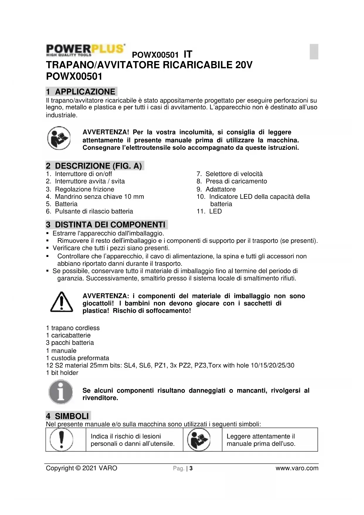 Leggere attentamente il manuale prima dell'uso.POWX00501 IT Copyright © 2021 VARO Pag. | 4 www.varo.com