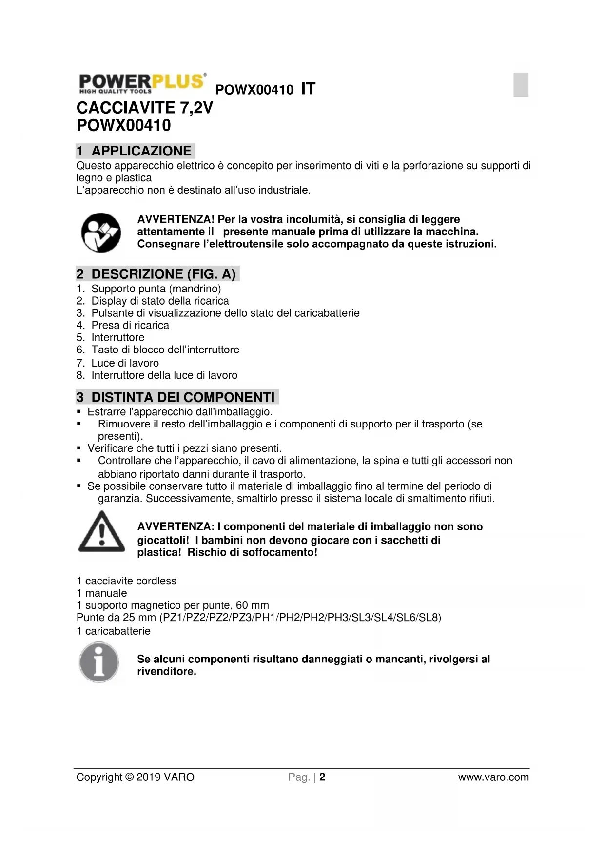 Copyright © 2019 VARO Pag. | 2 www.varo.com CACCIAVITE 7,2V POWX00410 1 APPLICAZIONE Questo apparecchio elettrico è concepito per inserimento di viti e la perforazione su supporti di legno e plastica L’apparecchio non è destinato all’uso industriale. AVVERTENZA! Per la vostra incolumità, si consiglia di leggere attentamente il presente manuale prima di utilizzare la macchina. Consegnare l’elettroutensile solo accompagnato da queste istruzioni. 2 DESCRIZIONE (FIG. A)