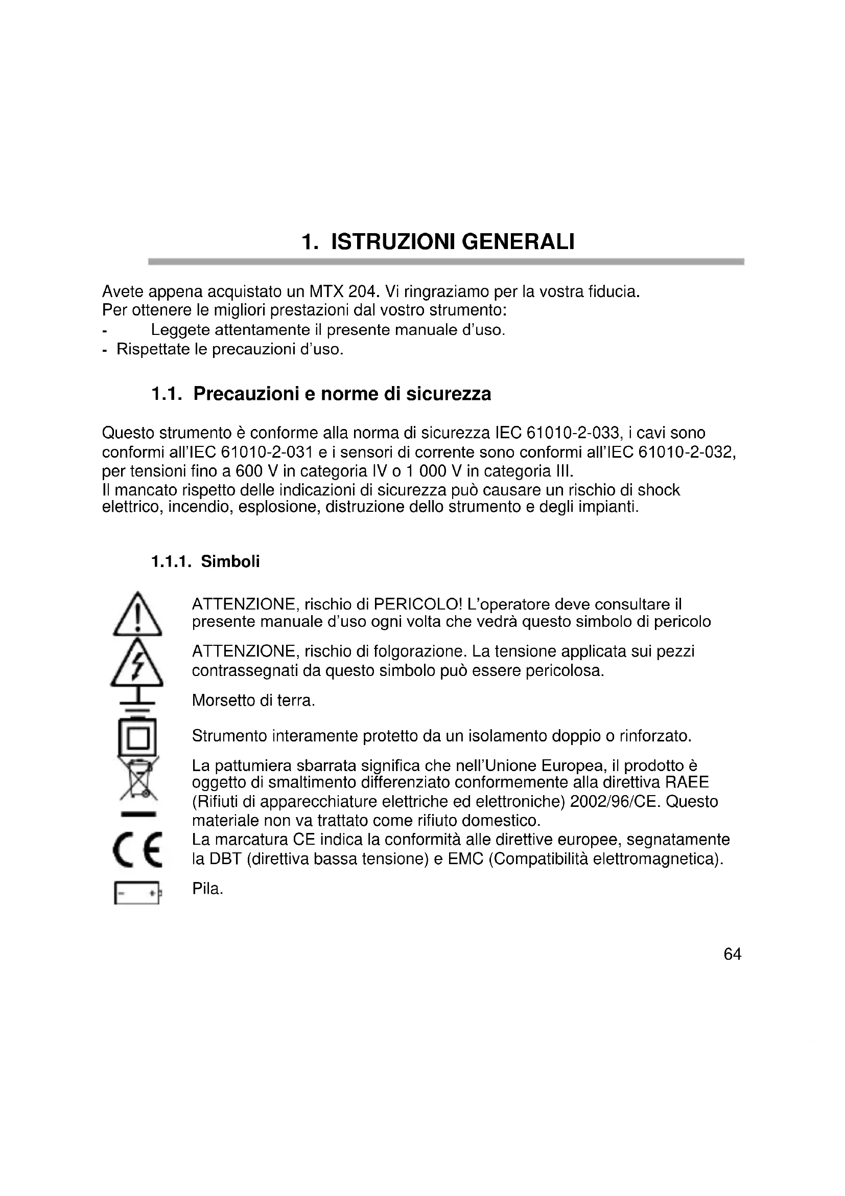 Avete appena acquistato un MTX 204. Vi ringraziamo per la vostra fiducia. Per ottenere le migliori prestazioni dal vostro strumento: - Leggete attentamente il presente manuale d’uso. - Rispettate le precauzioni d’uso. 1.1. Precauzioni e norme di sicurezza Questo strumento è conforme alla norma di sicurezza IEC 61010-2-033, i cavi sono conformi all’IEC 61010-2-031 e i sensori di corrente sono conformi all’IEC 61010-2-032, per tensioni fino a 600 V in categoria IV o 1 000 V in categoria III. Il mancato rispetto delle indicazioni di sicurezza può causare un rischio di shock elettrico, incendio, esplosione, distruzione dello strumento e degli impianti.