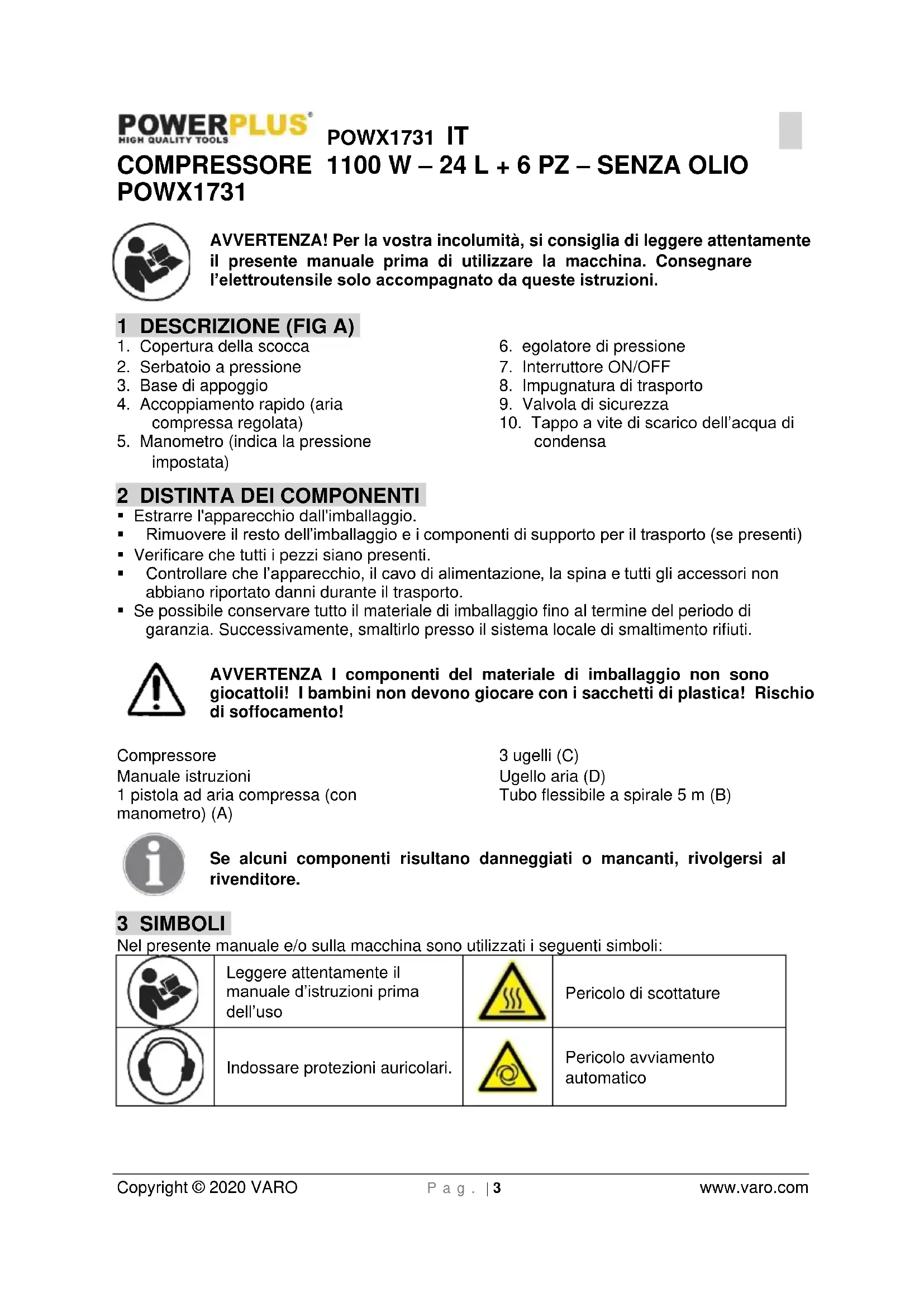 - Organo compressore e condutture raggiungono alte temperature durante il funzionamento. Toccandoli ci si potrebbe scottare.POWX1731 IT Copyright © 2020 VARO P a g . | 6 www.varo.com