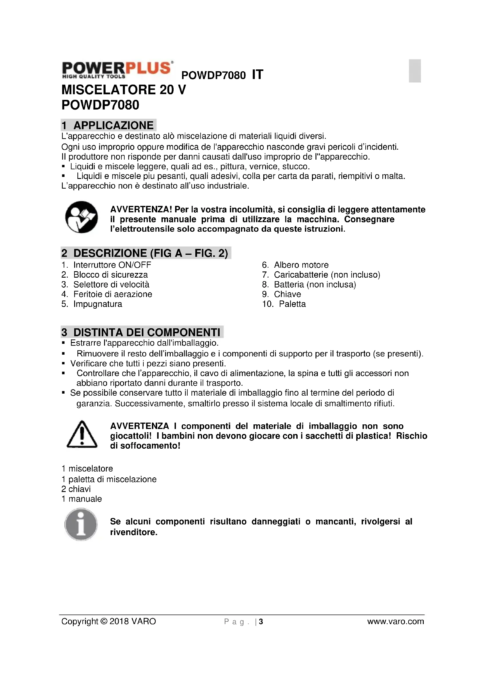 Copyright © 2018 VARO P a g . | 3 www.varo.com MISCELATORE 20 V POWDP7080 1 APPLICAZIONE L'apparecchio e destinato alò miscelazione di materiali liquidi diversi. Ogni uso improprio oppure modifica de l'apparecchio nasconde gravi pericoli d’incidenti. II produttore non risponde per danni causati dall'uso improprio de l''apparecchio.