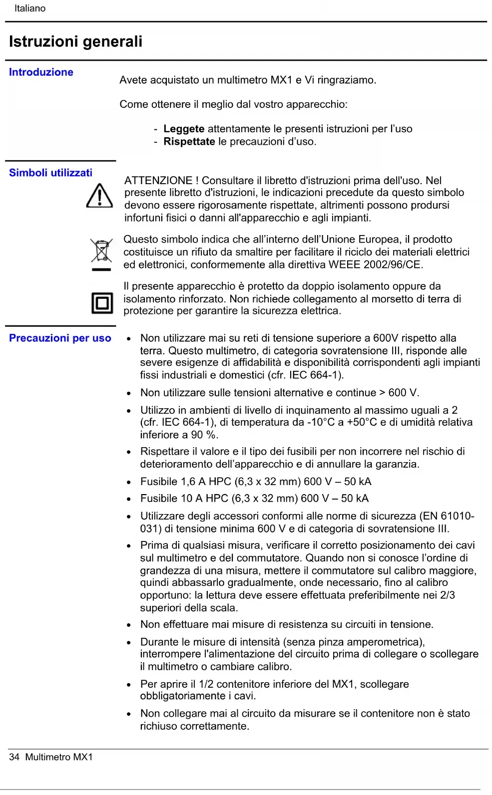 Avete acquistato un multimetro MX1 e Vi ringraziamo. Come ottenere il meglio dal vostro apparecchio: - Leggete attentamente le presenti istruzioni per l’uso - Rispettate le precauzioni d’uso.