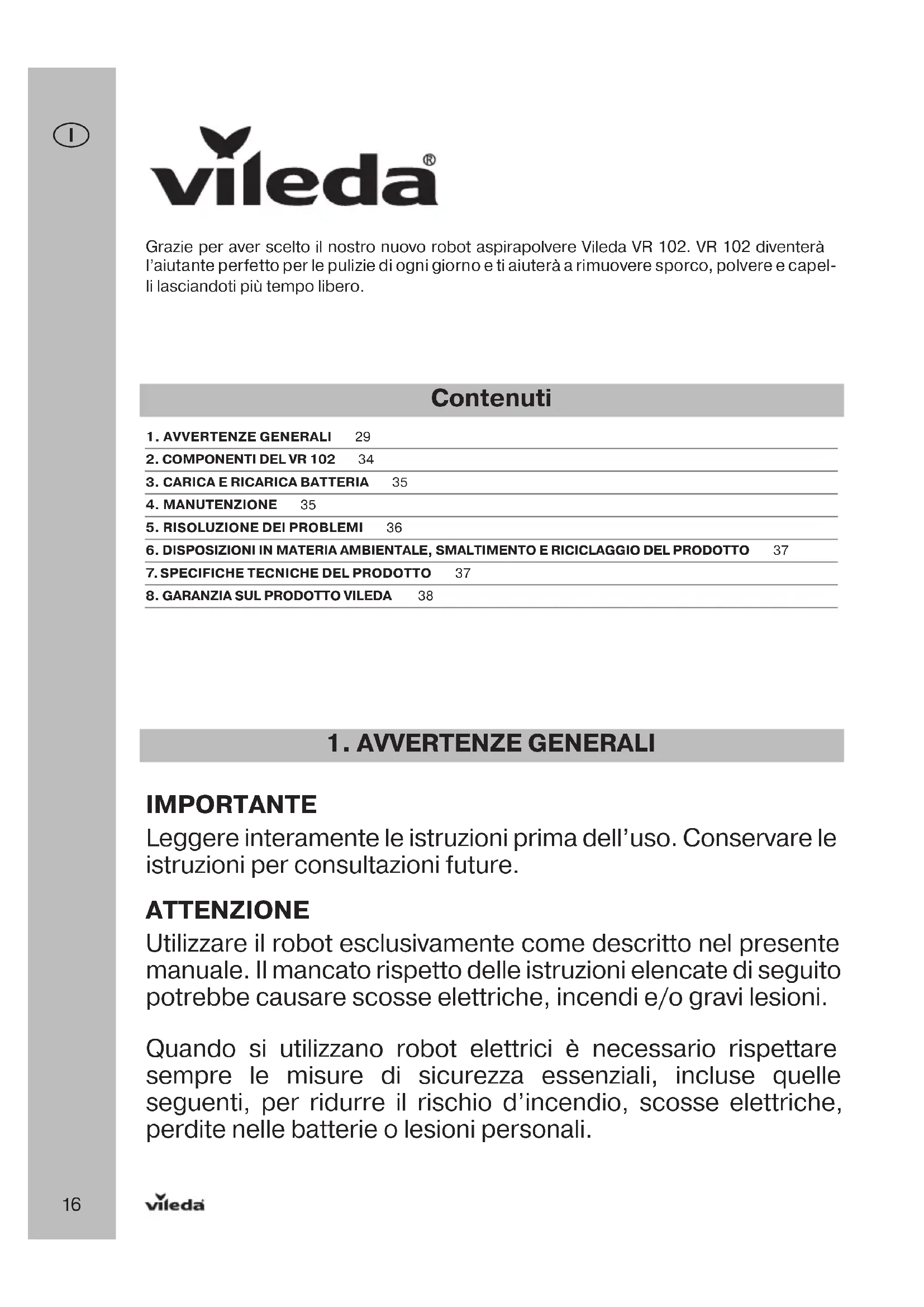 IMPORTANTE Leggere interamente le istruzioni prima dell’uso. Conservare le istruzioni per consultazioni future. ATTENZIONE Utilizzare il robot esclusivamente come descritto nel presente manuale. Il mancato rispetto delle istruzioni elencate di seguito potrebbe causare scosse elettriche, incendi e/o gravi lesioni. Quando si utilizzano robot elettrici è necessario rispettare sempre le misure di sicurezza essenziali, incluse quelle seguenti, per ridurre il rischio d’incendio, scosse elettriche, perdite nelle batterie o lesioni personali. Grazie per aver scelto il nostro nuovo robot aspirapolvere Vileda VR 102. VR 102 diventerà l’aiutante perfetto per le pulizie di ogni giorno e ti aiuterà a rimuovere sporco, polvere e capel- li lasciandoti più tempo libero. Contenuti 1. AVVERTENZE GENERALI 292. COMPONENTI DEL VR 102 343. CARICA E RICARICA BATTERIA 354. MANUTENZIONE 355. RISOLUZIONE DEI PROBLEMI 366. DISPOSIZIONI IN MATERIA AMBIENTALE, SMALTIMENTO E RICICLAGGIO DEL PRODOTTO 377. SPECIFICHE TECNICHE DEL PRODOTTO 378. GARANZIA SUL PRODOTTO VILEDA 3817