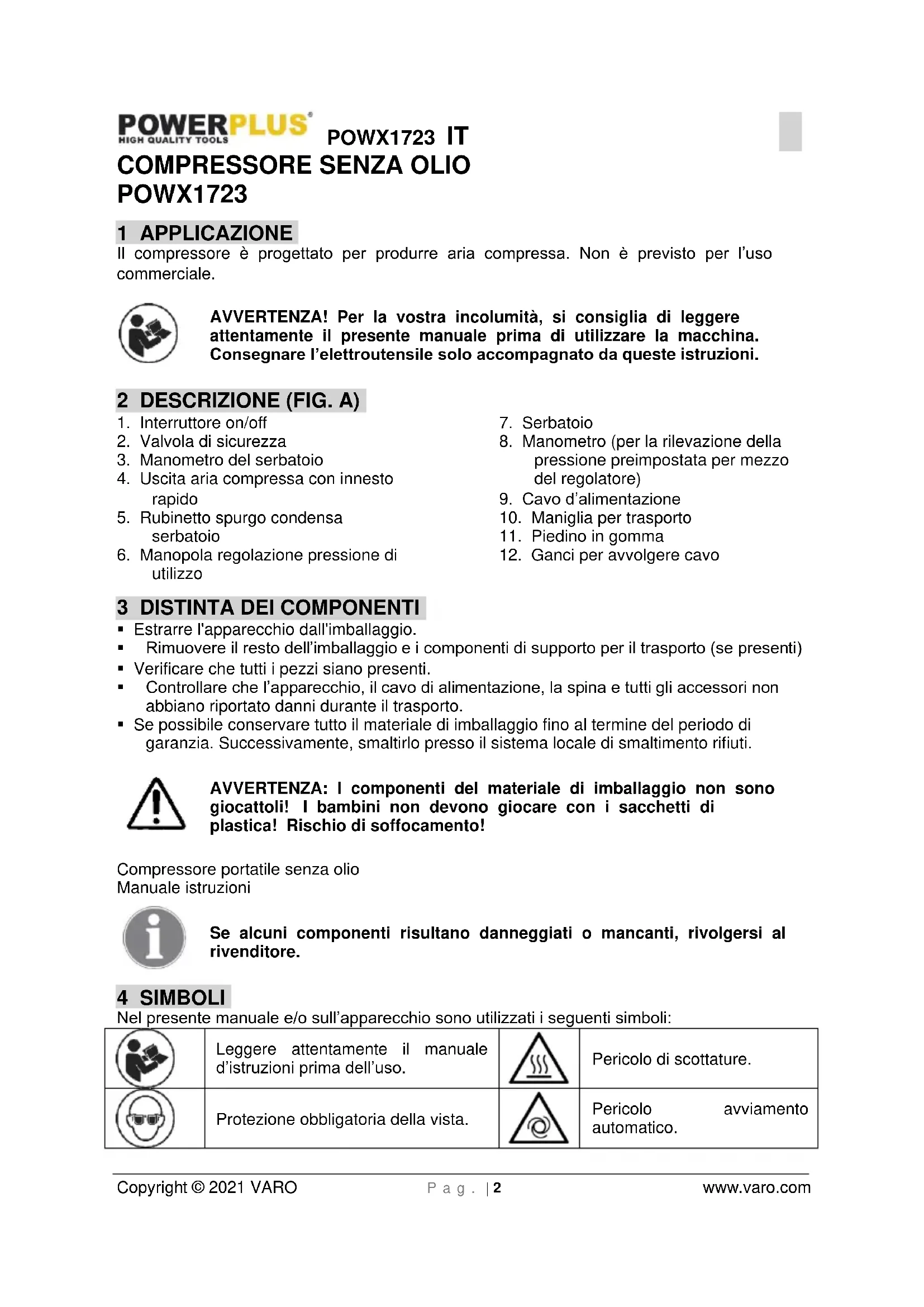 Pressione nominale 10 bar / 145 PSI Capacità serbatoio 12 l Debito d’aria (capacità) 180 l/min Peso 13 kg 10 RUMORE Valori di emissione di rumore misurati in conformità allo standard applicabile. (K=3) Livello di pressione acustica LpA 74 dB(A) Livello di potenza acustica LwA 97 dB(A) ATTENZIONE! Indossare protezioni acustiche se la pressione acustica supera 85 dB(A).POWX1723 IT Copyright © 2021 VARO P a g . | 8 www.varo.com 11 GARANZIA Questo prodotto è garantito per un periodo di 36 mesi a decorrere dalla data dell’acquisto da parte del primo utilizzatore. La presente garanzia copre tutti i difetti di materiali o produzione, esclusi: batterie, caricabatterie, parti difettose soggette a normale usura quali cuscinetti, spazzole, cavi e spine o accessori quali trapani, punte di trapano, lame di seghe, ecc.; danni o difetti derivanti da incuria, incidenti o alterazioni; costi di trasporto. Sono esclusi dalle clausole della garanzia danni e/o difetti conseguenti all’uso non conforme. Si declina ogni responsabilità per eventuali lesioni provocate dall’uso non conforme dell’apparecchio. Le riparazioni devono essere affidate esclusivamente a un centro di assistenza ai clienti autorizzato da Powerplus tools. Per ulteriori informazioni, telefonare al numero 00 32 3 292 92 90. Tutti i costi di trasporto sono a carico del cliente, salvo accordi diversi in forma scritta. Non sono inoltre consentiti reclami sulla garanzia qualora il danno al dispositivo sia dovuto alle conseguenze di una manutenzione inadeguata o di un sovraccarico. Sono inderogabilmente esclusi dalla garanzia i danni derivati da infiltrazione di liquidi, penetrazione di polvere, danni intenzionali (perpetrati deliberatamente o dovuti a negligenza evidente), uso improprio (scopi per i quali il dispositivo non è idoneo), uso non competente (cioè senza rispettare le istruzioni fornite nel manuale), assemblaggio da parte di personale inesperto, fulmini, tensione di rete errata. Questa clausola non è restrittiva. L’accettazione dei reclami in base al regolamento di questa garanzia non comporta in nessun caso la proroga del periodo di validità della stessa né l’inizio di un nuovo periodo di garanzia in caso di sostituzione del dispositivo. I dispositivi o i componenti sostituiti nel periodo della garanzia sono pertanto di proprietà di Varo NV. Ci riserviamo il diritto di respingere i reclami nei casi in cui non sia possibile verificare l’acquisto o quando sia evidente che il prodotto non è stato sottoposto a una corretta manutenzione. (pulizia delle aperture di ventilazione, regolare assistenza per le spazzole al carbonio, ecc.). Conservare lo scontrino come prova della data d’acquisto. L’apparecchio non smontato deve essere restituito al rivenditore in condizioni di pulizia accettabili, nella custodia preformata originale (se applicabile), accompagnato dalla prova d’acquisto. 12 AMBIENTE Ove la macchina, in seguito ad uso prolungato, dovesse essere sostituita, non gettarla tra i rifiuti domestici, ma liberarsene in modo rispettoso per l'ambiente. I rifiuti prodotti dalle macchine elettriche non possono essere trattati come i normali rifiuti domestici. Provvedere al riciclo laddove esistono impianti adeguati. Consultare l’ente locale o il rivenditore per consigli su raccolta e smaltimento.POWX1723 PT Copyright © 2021 VARO P á g i n a | 1 www.varo.com 1 APLICAÇÃO ..................................................................................... 2