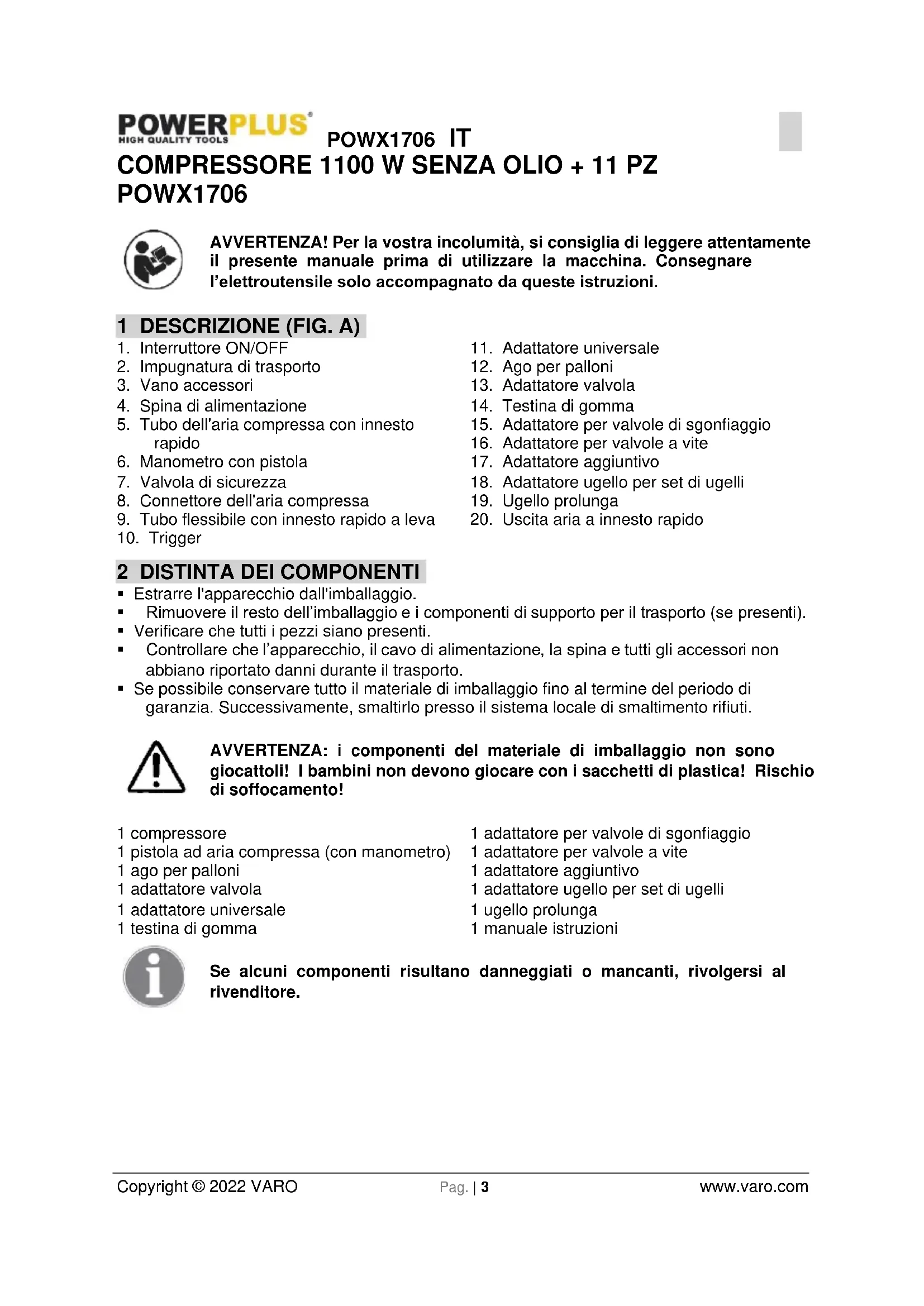 - Non permettere l’uso del compressore a persone inesperte senza adeguata sorveglianza. Tenere lontani dall’area di lavoro gli animali.POWX1706 IT Copyright © 2022 VARO Pag. | 8 www.varo.com