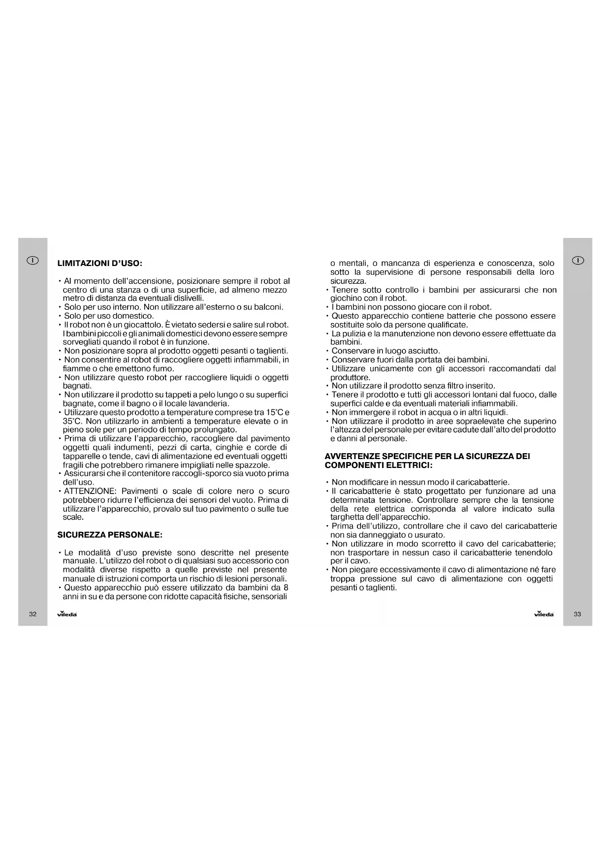 - ATTENZIONE: In caso di danni alla batteria, non tentare di ricaricarla ma contattare il Servizio Clienti Vileda all’indirizzo riportato sull’ultima pagina.